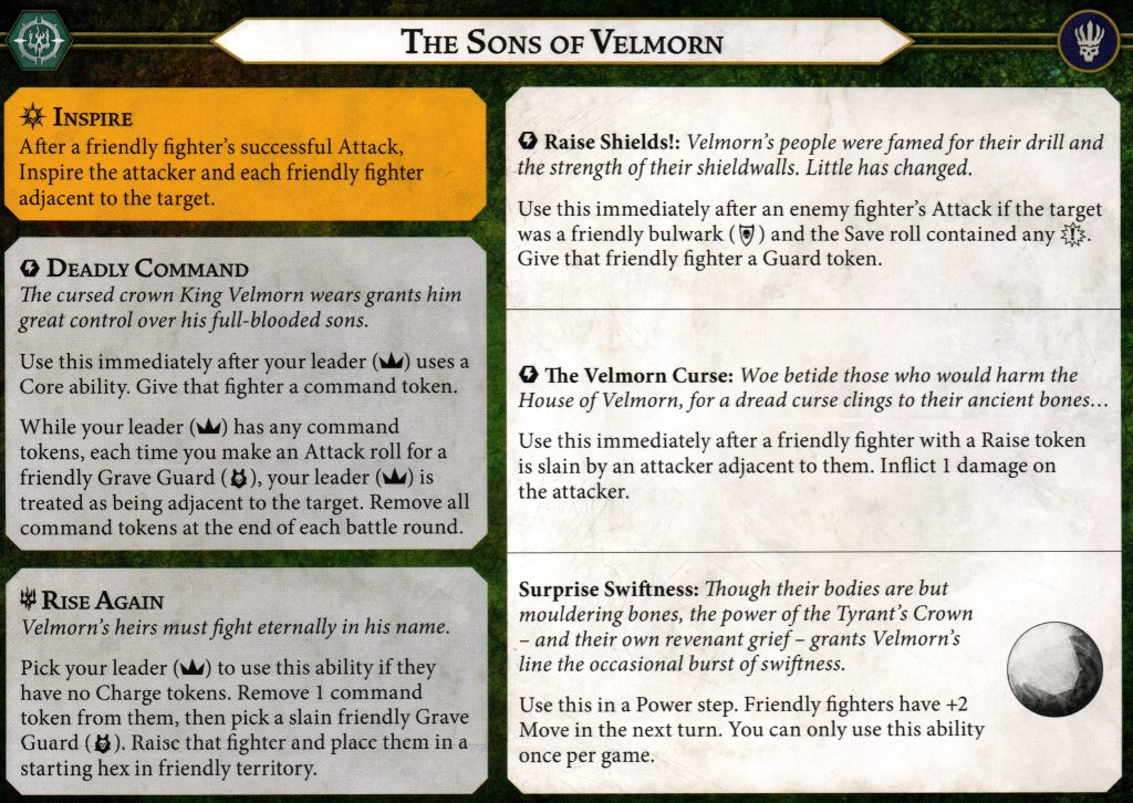 Deadly Command is the first of the leader-centric abilities on this warscroll. It's also going to shape how a lot of the rounds play out for you. The first activation will be something with Velmorn – likely a move, guard, or attack – in order to pick up the command token. Simply having a command token on Velmorn means your three Grave Guard will be more accurate. This not only helps with pushing damage through, but also inspiring them and Velmorn.
