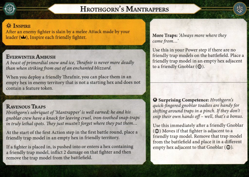 Ravenous Traps are basically the rest of the warband's mechanics. This particular ability outlines when you place your first one (at the start of the first action step of the first battle round), where it goes (anywhere in friendly territory), and what it does (deals 2 damage to any fighter that enters the same hex as a trap). Dealing 2 damage is a lot, especially when it doesn't require any rolling or necessarily take up your turn to do so. However, traps are indiscriminate and will happily munch your own fighters. I can already see me getting driven back into my own traps and feeling my soul leave my body.