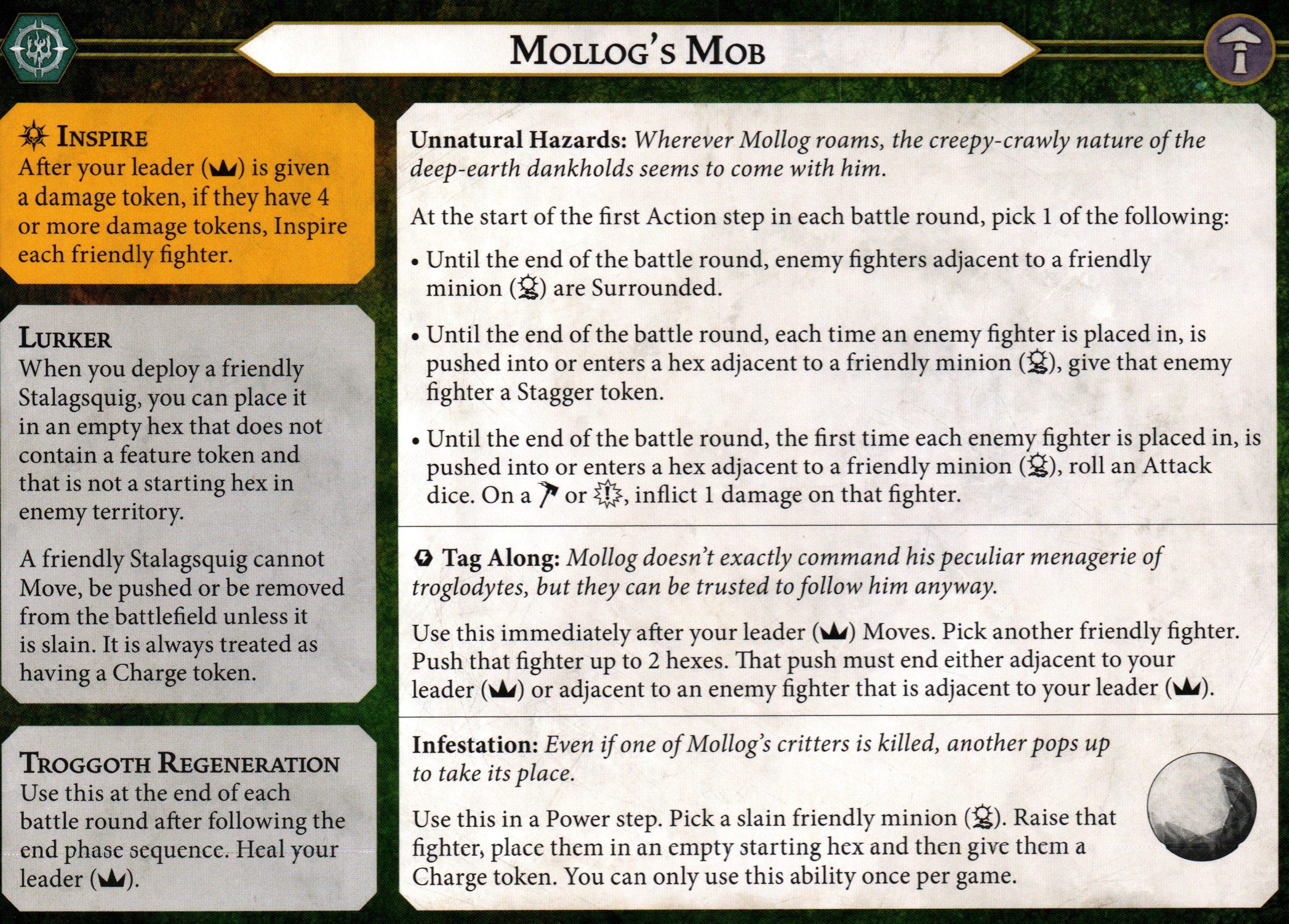 The inspire condition hasn't technically changed – Mollog has to take damage, and once he has had enough the entire warband flips. He does have a substantial amount of health so if the opponent does try to take out your leader, you'll at least be likely to get an activation or two out of him before he dies. That said, it's fully dependent on your opponent whether your warband inspires at all.