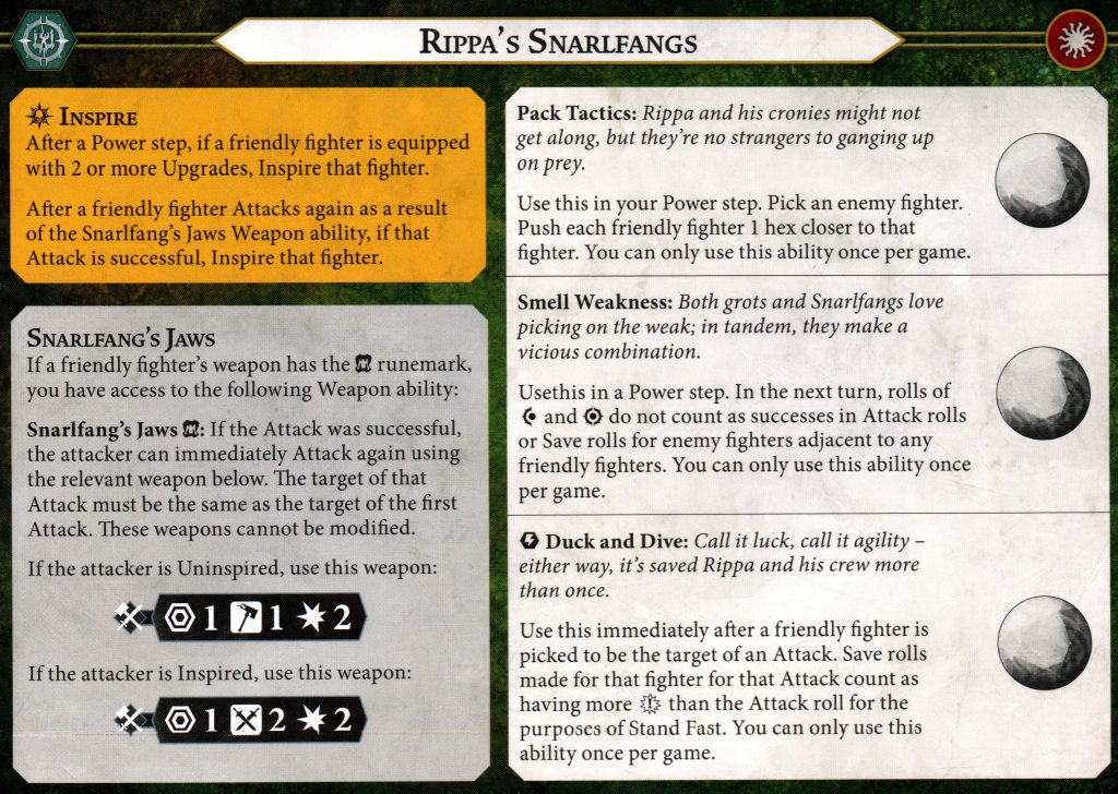 The original version of Rippa's Snarlfangs had a single inspire condition for the leader and a different one for Stabbit and Mean-Eye. This time around, there are still two ways to inspire but they now apply to any fighter – this extra flexibility is going to prove useful and will help ensure these wolf riders inspire quickly. The first method is one that you have full control over. Simply put two upgrades onto a fighter and they'll inspire. I like how this adds some extra importance to 0-cost upgrades as a way to quickly shift your fighters to their improved stats. The other inspire method is going to hinge more on randomness and your luck because it requires making a successful attack with Snarlfang's Jaws.
