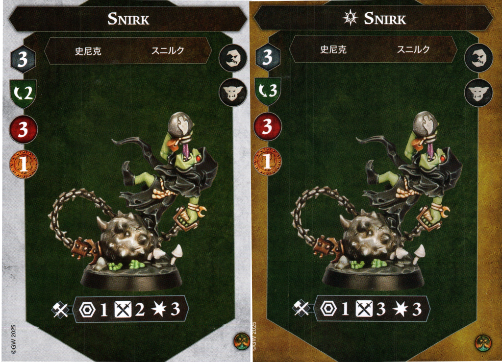Snirk is a valuable damage dealing tool for the warband. He also starts on the same defense as Zarbag but shoots up to 3 dodge once inspired which will make him quite frustrating to deal with, especially for any warbands that have to close within 1 range to deal with him due to the Spinnin' rule.