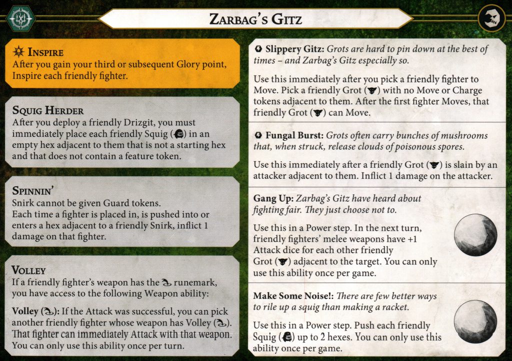 Gang Up is yet another completely new ability for the warband. Now, the warband with 9 fighters with superb movement efficiency who absolutely saturate the board, also can turn that board presence into increased accuracy on any of their surprisingly solid attacks. Expect the 3 damage Snirk attack, balanced by only having a 2 sword attack profile, to be rolling 4+ dice and doing a convincing Kro-Jax impression regularly. Even when used on one of the "average" fighters like a squig, Drizgit, or Zarbag, you're getting a fist full of dice looking for hammers.