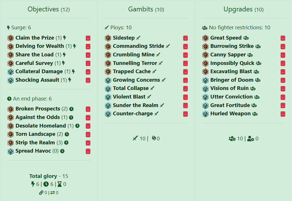 It’s kind of a no-brainer at the moment, but pairing this warband with Pillage & Plunder is too good to pass up. Both the warband and the deck are incentivizing you to delve, so you might as well score a bunch of glory for doing so at the same time. I mentioned in my review of Countdown to Cataclysm that it feels like a deck that can play up the control angle of the game provided it can find a suitable warband and another deck to combine with it in Nemesis, and I think Zondara is that warband. The card advantage Unearth can generate combos well with the denial some of the Cataclysm cards can lean into. Here’s what I’m going to be playing with this warband first, once I get them painted up!