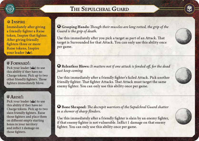 All the fighters here start on 2 move and inspire to 3. Since the Forward! ability has your fighters move (and not push a set amount like another warband we’ll talk about), they’ll be able to cover more ground once they’ve been flipped. Despite being a 7 fighter warband where every fighter is worth 1 bounty, your leader is tremendously important. You cannot do double moves, nor can you raise once the Warden goes down. Protecting the warden is going to determine how well you do in games with the Sepulchral Guard. His attacks are more or less the standard middle grade attacks for a leader – R1/H2/D2 and R2/H2/D1. He gains a nice damage boost when inspired, but you’re honestly not going to be making too many attacks with this guy. When push comes to shove, he can at least fight back though. Defensively, the Warden only has 4 health and 1 block no matter his inspiration status. Finding upgrades or ploys to bolster his survivability and shuffle him off somewhere safe will be important to keep in mind when choosing pairings for this warband.