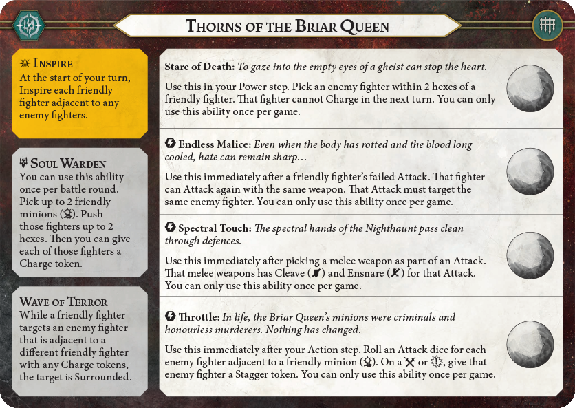Speaking of Soul Warden, this is a once per battle round core ability. You can push up to 2 of the minions (so anything other than The Briar Queen or Varclav) up to 2 hexes, then have the option to give the pushed models a charge token. Of note, this ability isn’t tied to any of your models. In previous editions, Varclav had this ability so if he was slain, you’d lose access to it. Now you can continue to push your chainrasps around regardless of whether your leader or her lieutenant is still around. Pushing means you’re not going to be able to benefit from fly, which is something I’ve caught myself up on a few times in the past. Just throwing that out there as a heads up in case you’re anything like me.