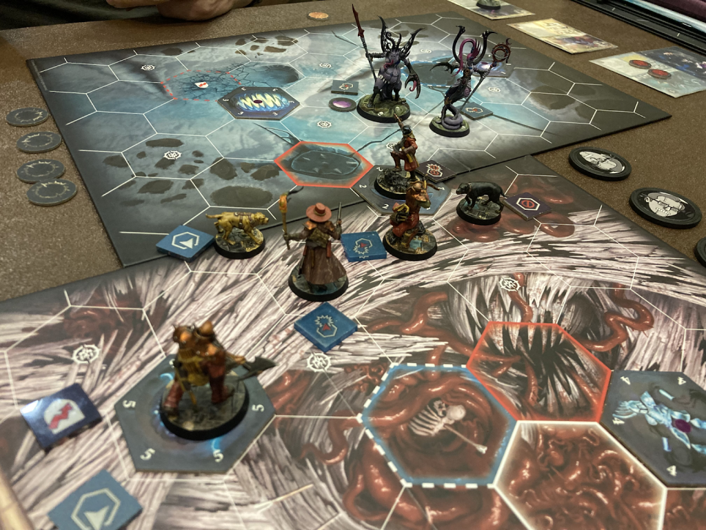In our second game, I had a better handle on Travis’s tricks and prioritized my targets better. Also in this game, I saw one of the neatest tricks I’ve seen yet in an Underworlds game. I had given Aemos, my big bruiser, the Unnatural Resilience upgrade - which reduces incoming damage but cannot be given to a fighter with 5 or more Wounds. Travis responded by playing Scapegoat, which allowed him to choose an enemy fighter (Aemos) to have a Wounds characteristic of 5 and become easier to hit for the rest of the round. This broke Unnatural Resilience, and gave Travis an extra Glory when he quickly killed Aemos. A perfect execution!