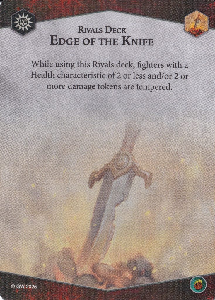 Credit: Games WorkshopEdge of the Knife is the second deck in this edition to have a plot card, although it only barely qualifies as such. This does mean that it cannot pair with Countdown to Cataclysm (or any future plot card decks) for Nemesis, which is a downside since CtC has been showing up fairly often as a supportive deck that can work for almost any game plan. As for what the plot card itself does… well, it doesn't really do anything. It just gives you a new term ("tempered fighters") and defines it (any fighters with a health characteristic equal to or less than 2 and/or any fighter with 2 or more damage tokens). Many of the cards in this deck are going to care about tempered fighters, so this seems like it's mostly a way of saving text space on the cards or potentially being used as a balance lever to specifically prevent the deck from pairing with other plot decks in Nemesis.