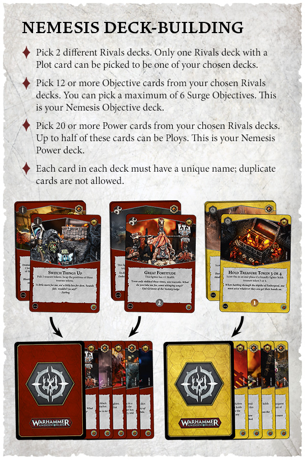 One plus one equals FUN. Nemesis deck-building rules for Warhammer Underworlds Embergard. Credit: Warhammer CommunityFortunately, how it works now is a solid foundation. You’ll still be combining two Rivals decks into one, but this time there won’t be a warband deck in the mix. One thing I’m excited about here is how this change opens up more combinations for each warband.