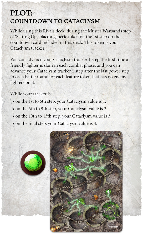 The mechanics to advance the Cataclysm tracker lends itself naturally to certain play styles. Getting to advance the counter the first time each round when a friendly fighter dies could be leveraged to disincentivize your opponent from going after a forward treasure token holder (or more likely give you a small boon when that inevitably happens). Perhaps a warband could be set up to missile one fighter into the midst of the enemy territory each round – normally this over-extension can be punished by taking out the stranded fighter, but if you’re able to do enough damage in an alpha strike you could recoup that loss.