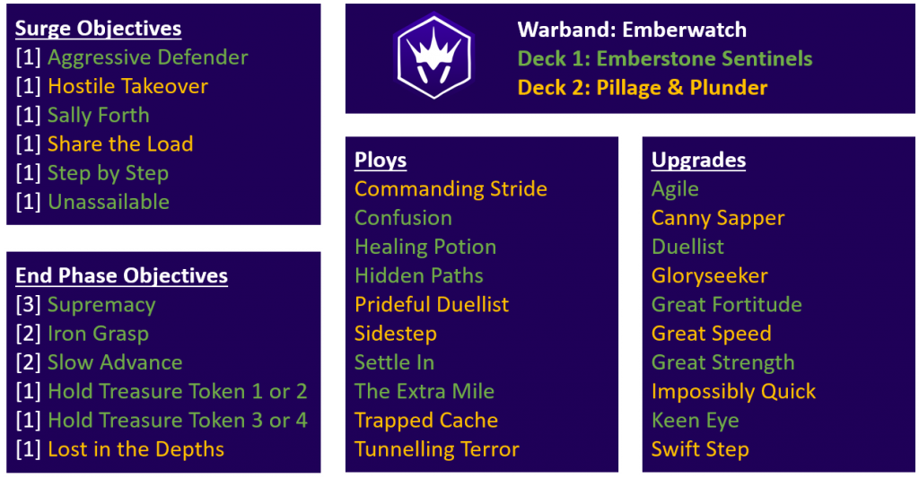 The fact that a good number of objectives in the new decks key off of making attacks, and some from the Take and Hold, Flex, and Mastery deck all key off making attacks when standing in particular places, increases the impact the Emberwatch’s ranged weapons will have. In fact, that’s probably the first build I would take with them – a pairing of Emberstone Sentinels and Pillage & Plunder, with a focus on the former.