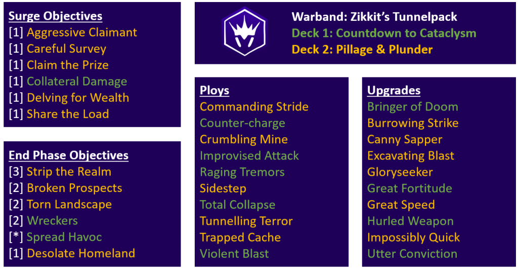Credit: JakeDelve, baby, delve! This is a very greedy deck which I felt was appropriate considering the risky abilities of the Skaven themselves. A whopping 18 glory awaits you in this deck if you can get those treasure tokens flipped over. The deck also packs a bevvy of weapons so you can upgrade the dinky attack profiles of your fighters, including Tik Tik! There’s a tiny bit of added synergy in that your Cataclysm tracker will go up the first time one of your fighters is slain every round, so even if your opponent doesn’t want to hit you, you can do Skryre things and pop your own fighters. Plus you can engineer a situation where Tik Tik has the surge Tik Tok. It’s too good to pass up.