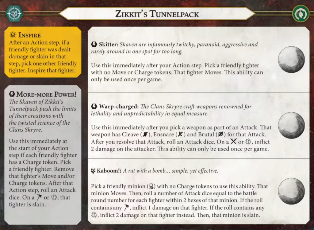 Credit: Games WorkshopBefitting a scraggly band of cowardly rats (positive connotation), none of these little guys are going to inspire before they get to see one of their “buddies” get punched in the face. Look, don’t lie to me and say you’ve never had a coworker that was so annoying your day wouldn’t become better by seeing them get punched in the face. One thing that’s important to note here is that the damage or slaying of the friendly rat must occur during an action step – that means if your opponent uses a power card to damage one of the Tunnelpack, nobody is going to find that particularly inspiring.