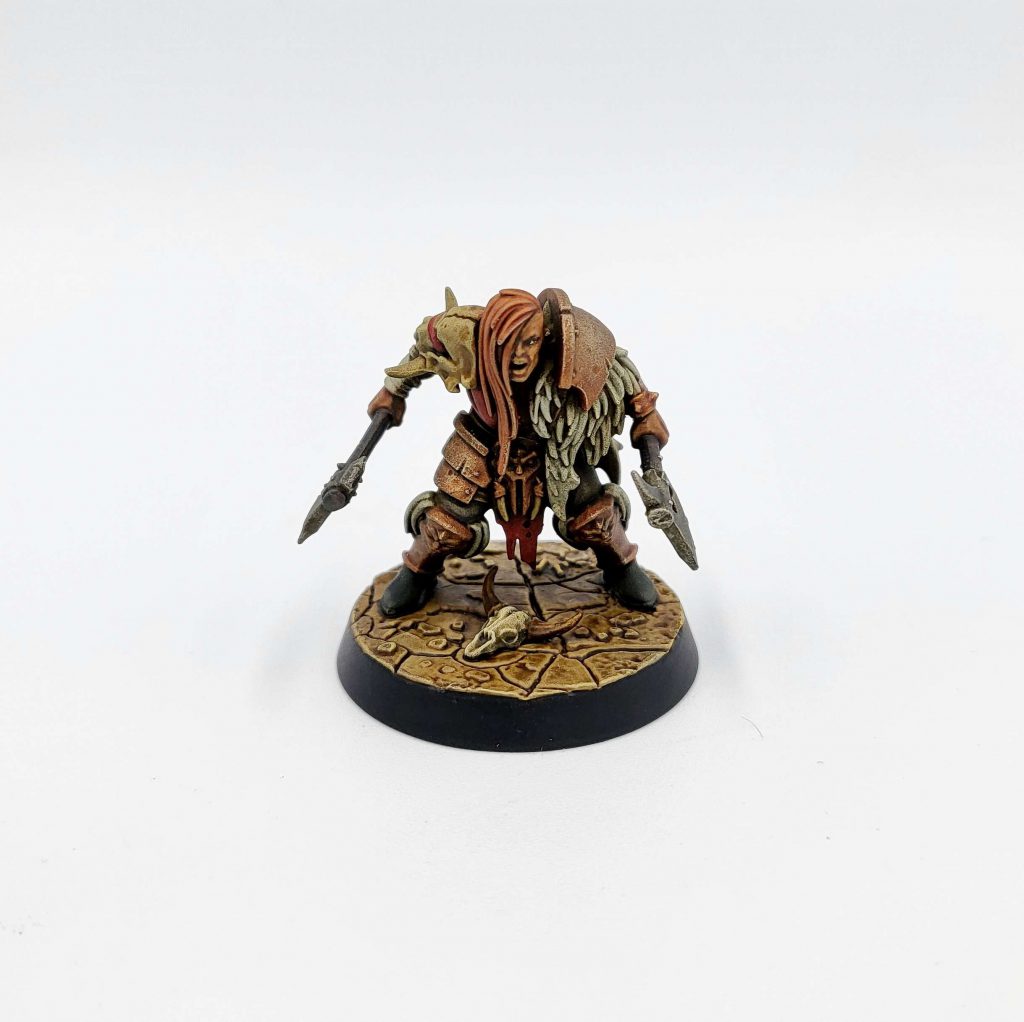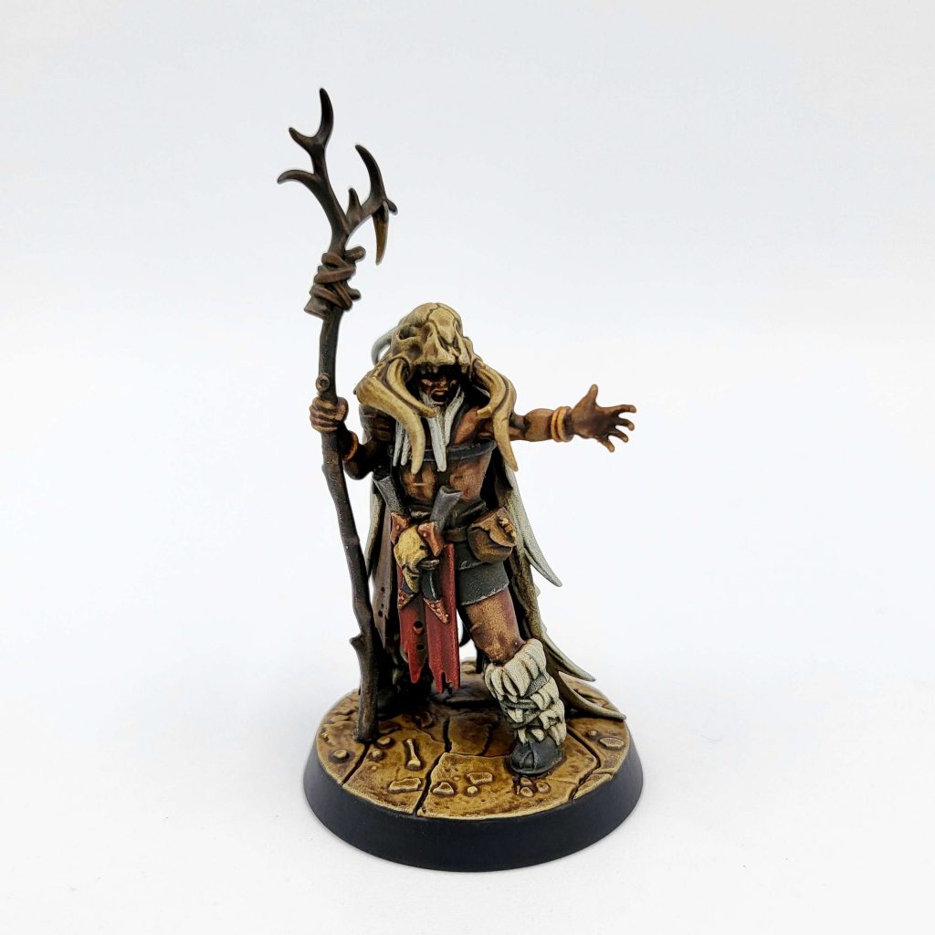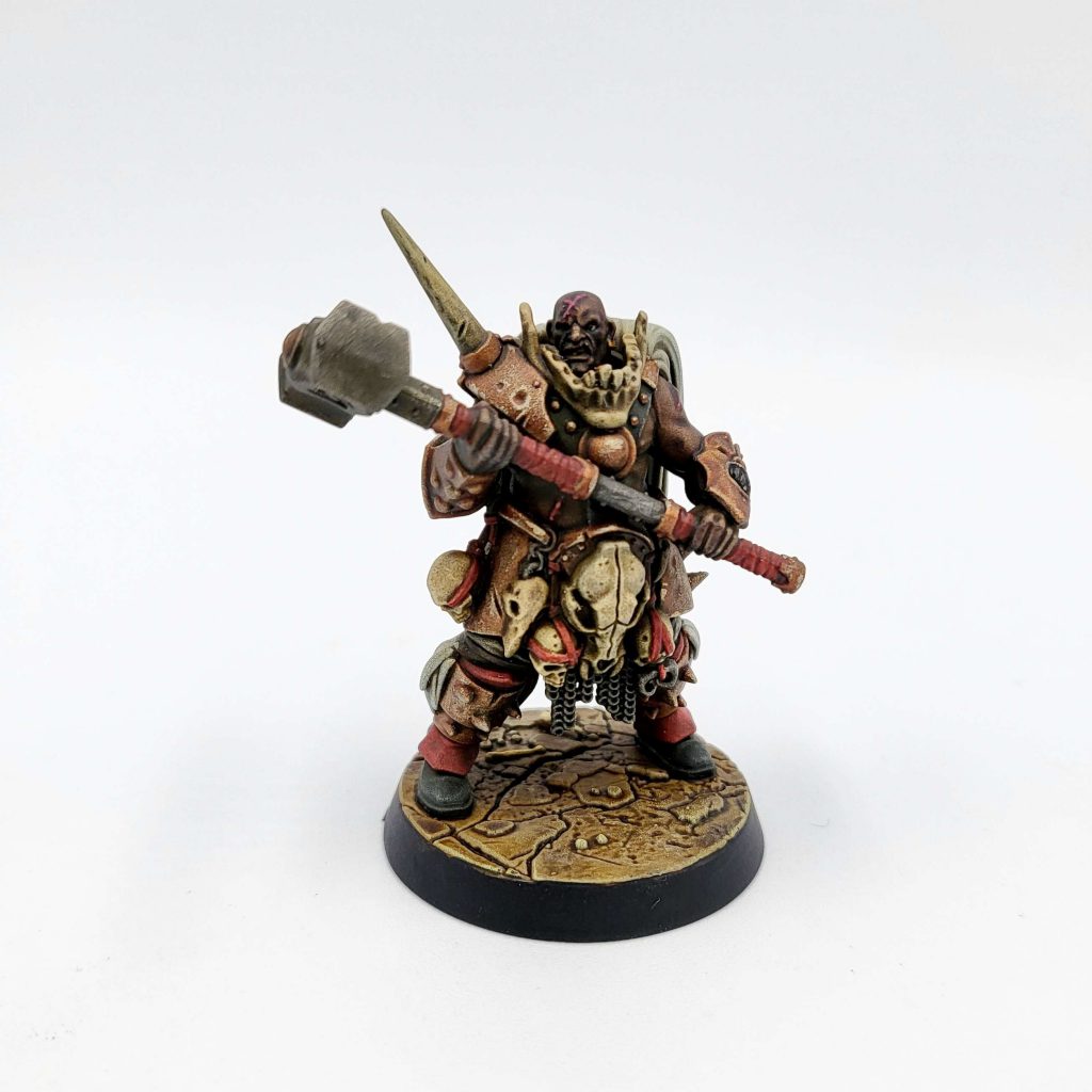My aim here was to lean into the box art while sticking to some of the design elements common to my S2D dudes... which is basically the combo of Blood Angels Red, grey, and black. I started with a zenithal prime and did flesh tones first. For the hammer dude's dark skin I used 4:1 medium:contrast Cygor Brown and washed with (new) Reikland Fleshshade. For the others, I used 1:2 medium:contrast mixes of flesh colors and washed with new Reikland after. Thinned contrast paired with a glaze of the reformulated Reikland does simple and excellent skin tones!Flags, ties, armor, and other assorted drip got a bit of Blood Angels Red. Boots and some straps got Black Templar. Wood and some leather got Wyldwood, while the shaman dude's cloak got Snakebite Leather. All of the Fur (and the white beard) was basecoated with Grey Seer, washed with Apothecary White, and Drybrushed (CAREFULLY) with White Scar. Bone details were washed with Skeleton Horde and drybrushed with Ushabti Bone.