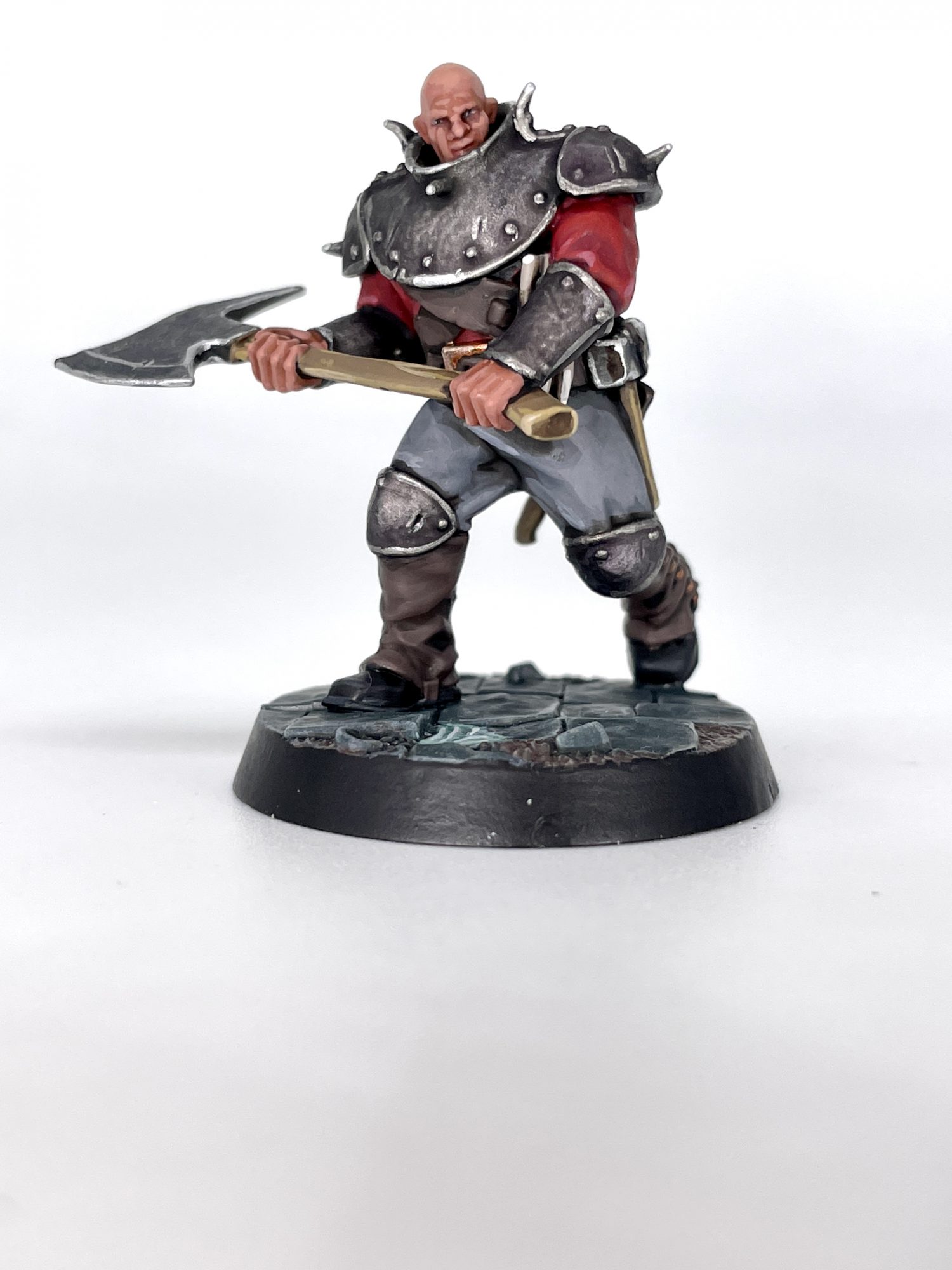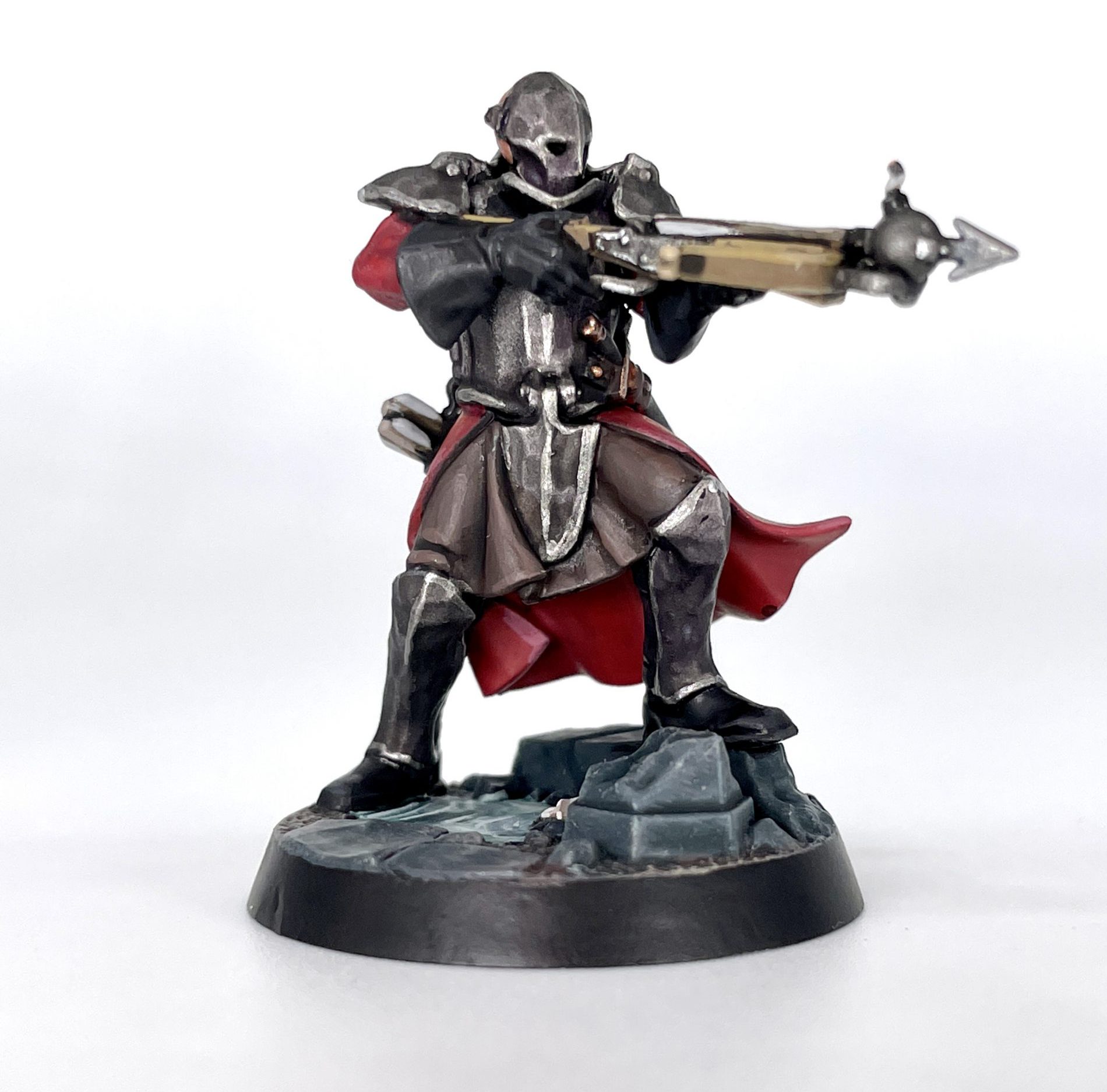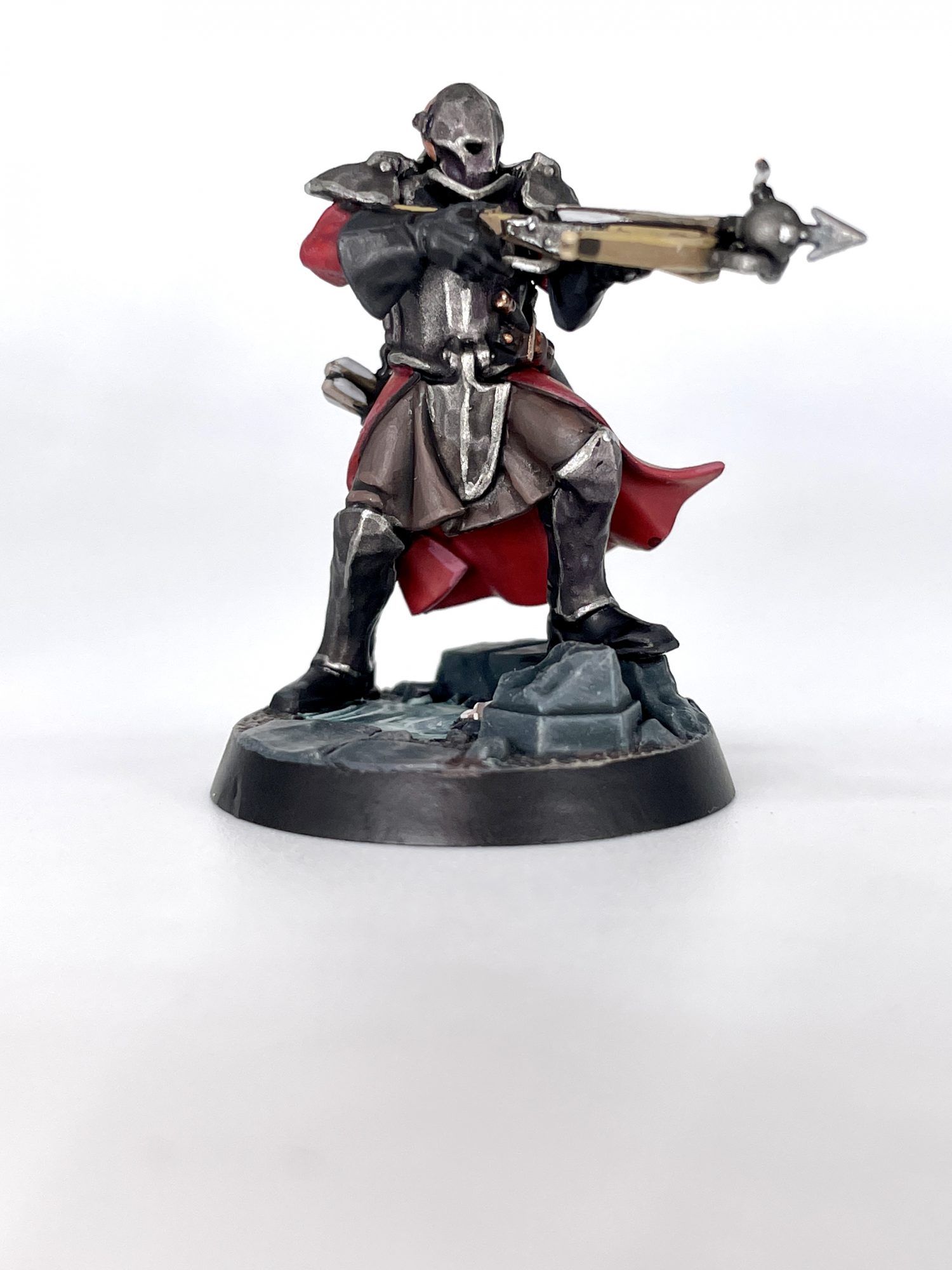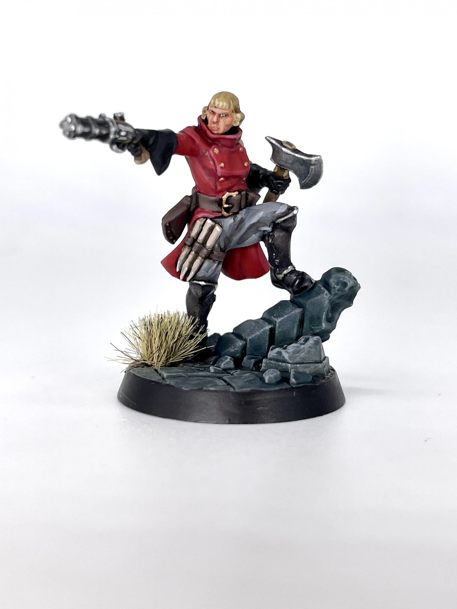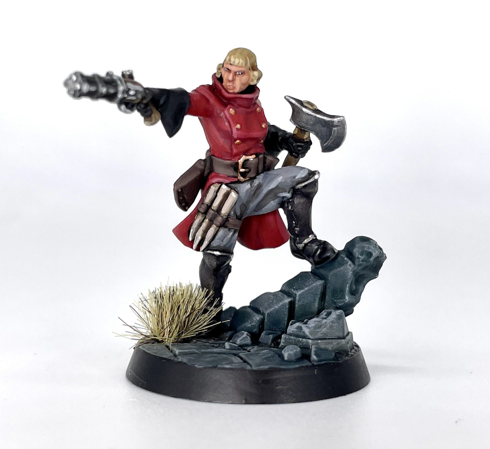 Brydget Axwold. Credit: SRMAs I painted the majority of each model in red and slightly tinted the metallics with a variety of colors, I kept the rest of my scheme fairly neutral. Getting to some of the faces can be tricky, as they all have raised collars or other details somewhat obscuring them.