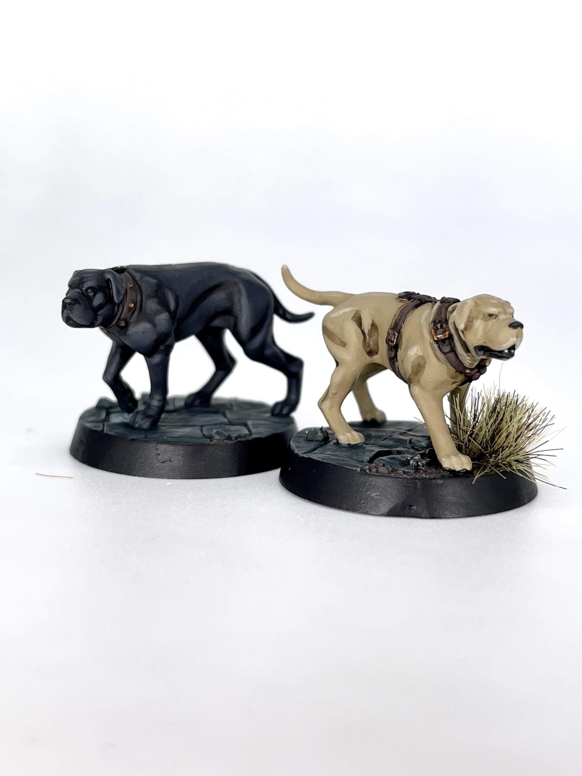 Grotbiter and Ratspike. Credit: SRMI painted the doggos separately as they're not generally wearing the same colors as the rest. While I tied their collars in to the leather recipe, they were an opportunity to paint some other colors. I still kept them fairly natural, as this warband is a bit more grounded than the high fantasy aesthetic that AoS is known for. This also meant I got to spend half an hour Googling pictures of golden retrievers and black labs, which I highly recommend.