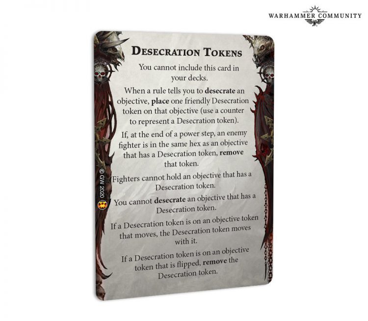 Desecration is an overarching mechanic for the warband, which allows them to prevent an Objective from being held until the token has been cleared. To clear a token, an enemy fighter must be standing on it at the end of a Power Step. This is important as it prevents Objectives from being held for purposes of Surge Objectives - Temporary Victory, Bold Conquest, and Hidden Purpose all get stopped by a Desecration token - but it does nothing for End Phase Objectives like Supremacy or Dug In, and doesn’t stop scoring for things like Cryptic Companion or Cursed Keys.Desecration Tokens are created by killing enemies that are holding Objectives, killing enemies while holding an Objective, standing on an Objective in the End Phase with your two faceless mooks, or by playing certain Gambits. It’s also worth noting that the “Kill” option for creating a token is a Reaction, and therefore prevents you from playing any other after-Activation Reactions, and can be blocked by enemy Reactions. Which… kinda sucks.