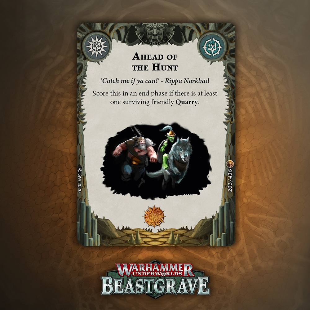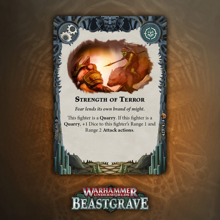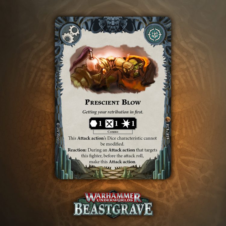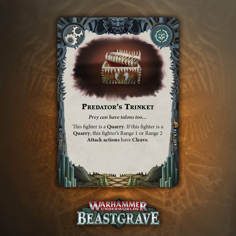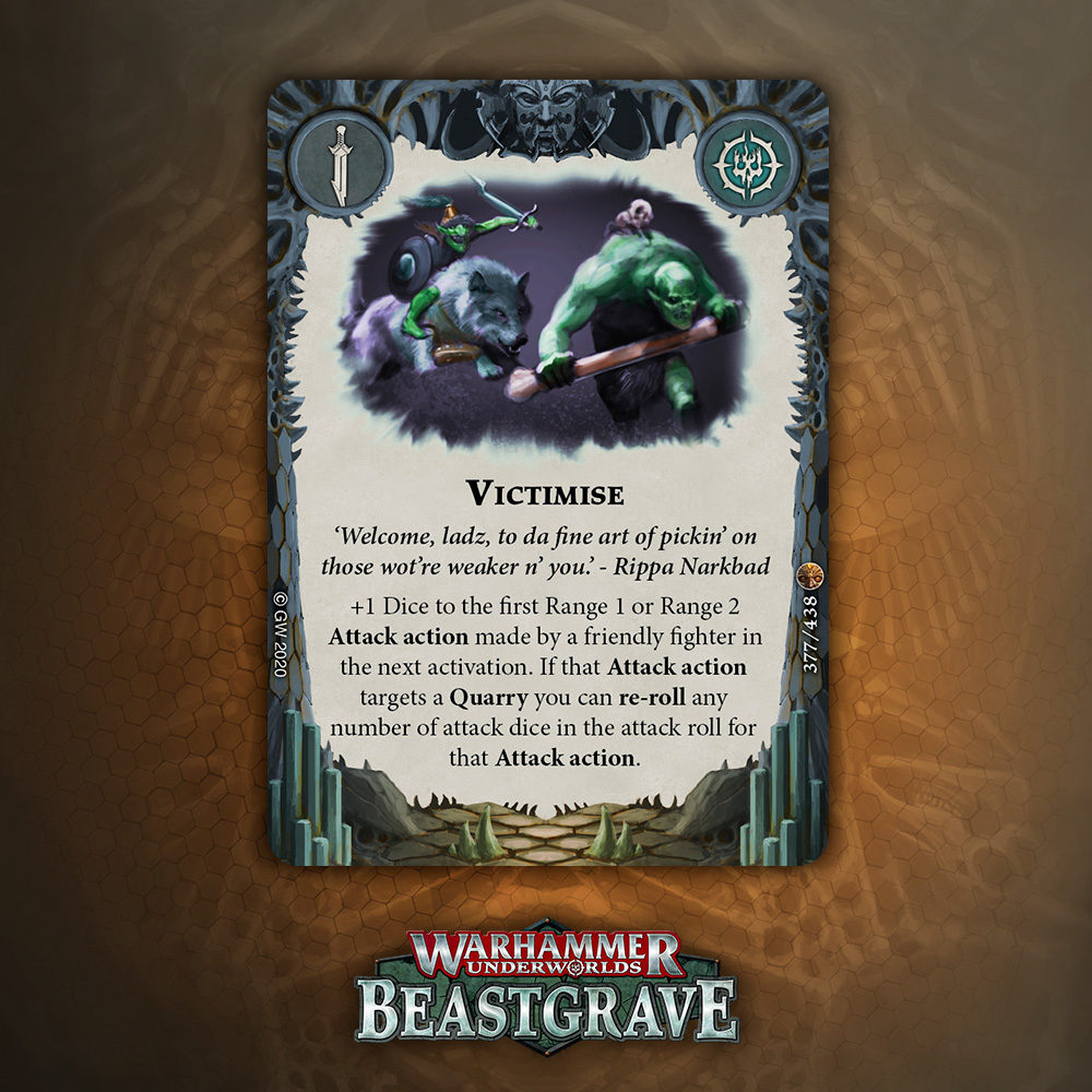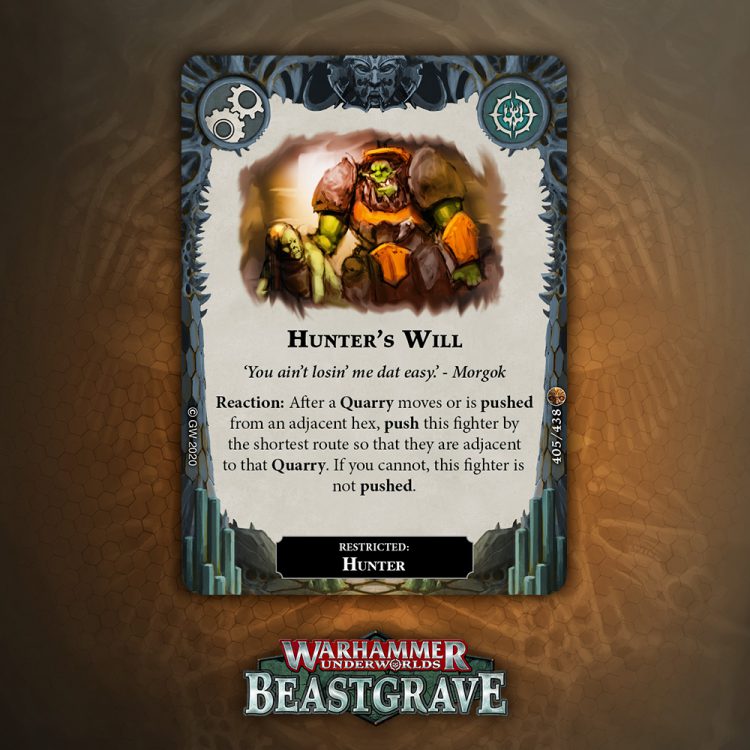 Cleave is great, but is it worth an Upgrade slot that doesn’t boost damage or precision? Arguably Cleave is technically precision, except it’s not against Dodge warbands, and does nothing if you miss the dice. I think there are better Quarry cards, but I would consider this if my meta was full of Morgok, Stormcast, Wyrmspat, and the like.