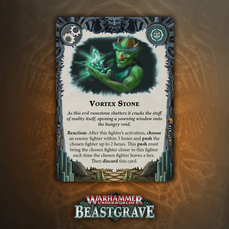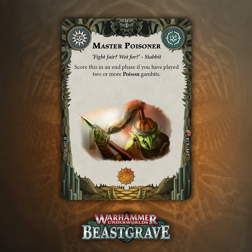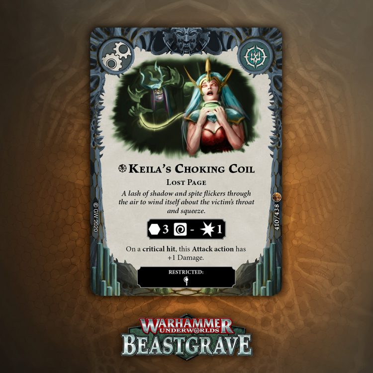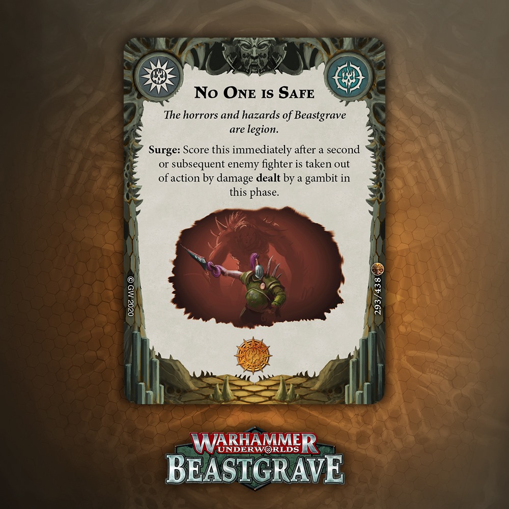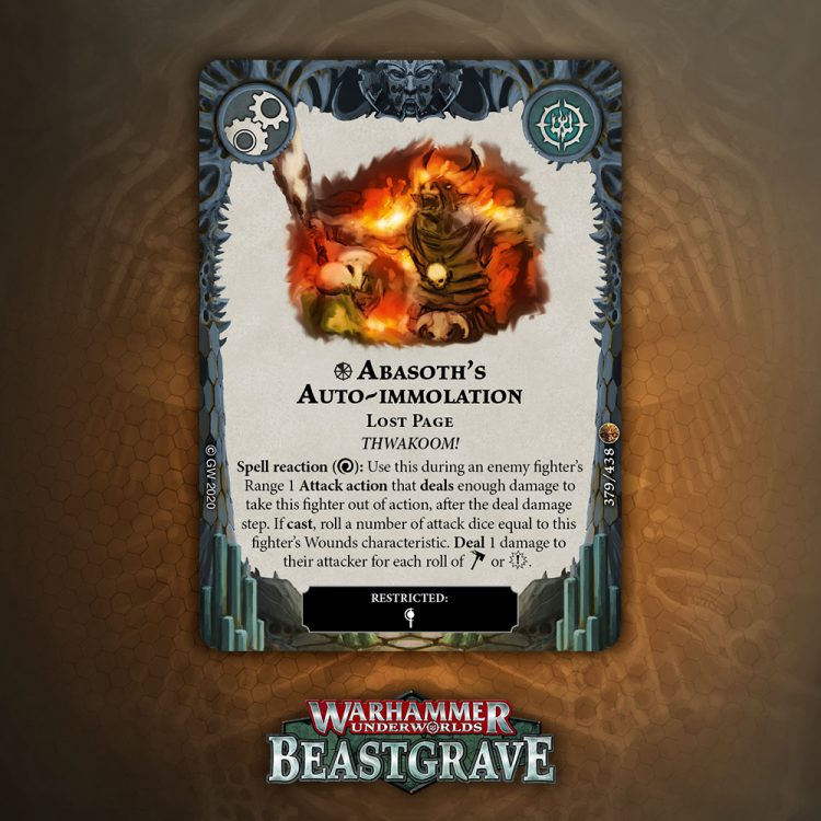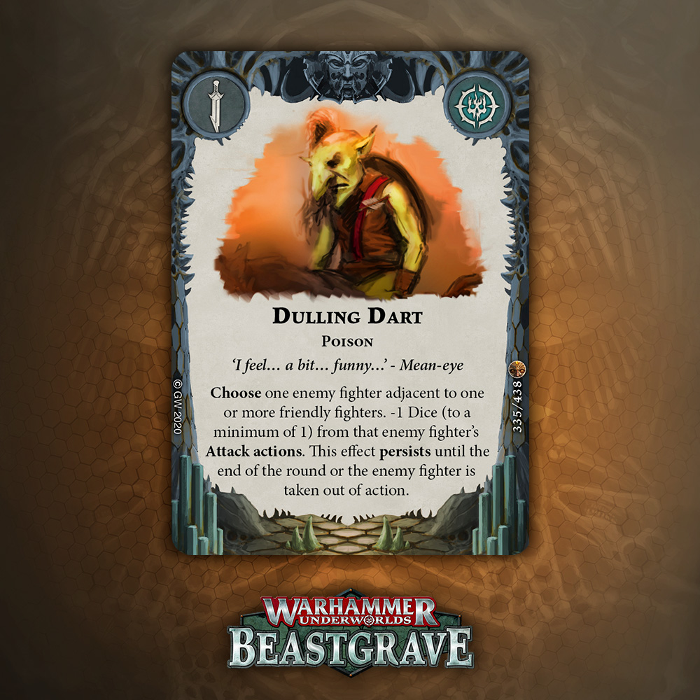 I like the design of this card a lot, especially for tougher warbands that can take a hit and keep fighting, but overall one damage plink that relies on being attacked, being driven back, and surviving doesn’t inspire a lot of confidence. That said, it blocks the reaction window for Pit Trap and Snare, which is nice enough to warrant consideration.