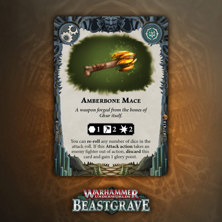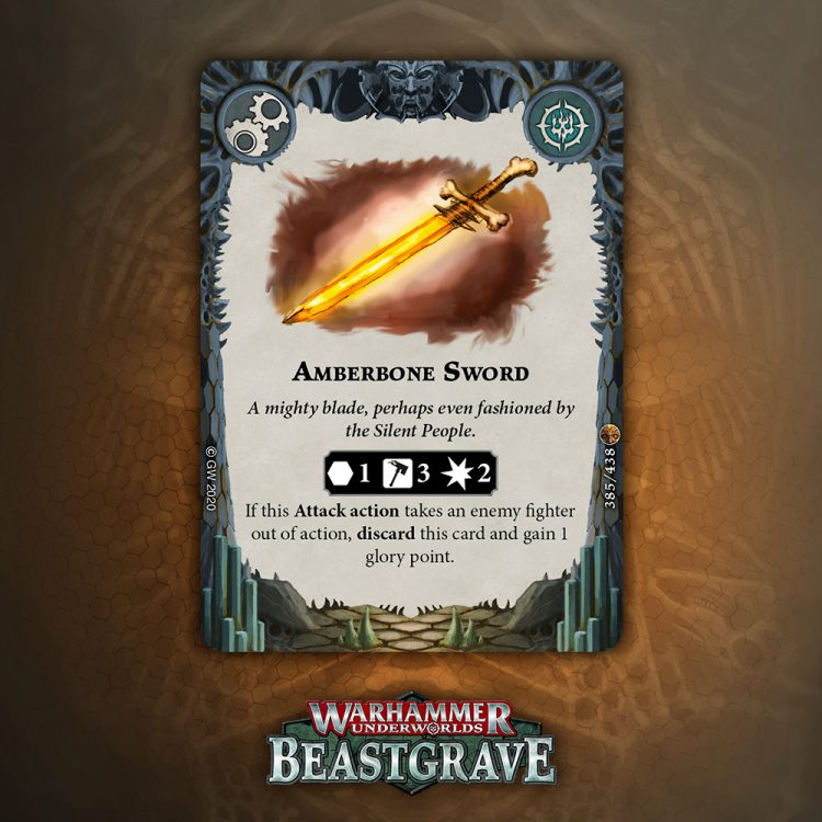 Amberbone weapons are excellent, though I’m not sure if the reroll is as good as the Sword just flat having 3 dice. Either way, it’s a good pick for decks that are packing multiple weapons, not much more to say.