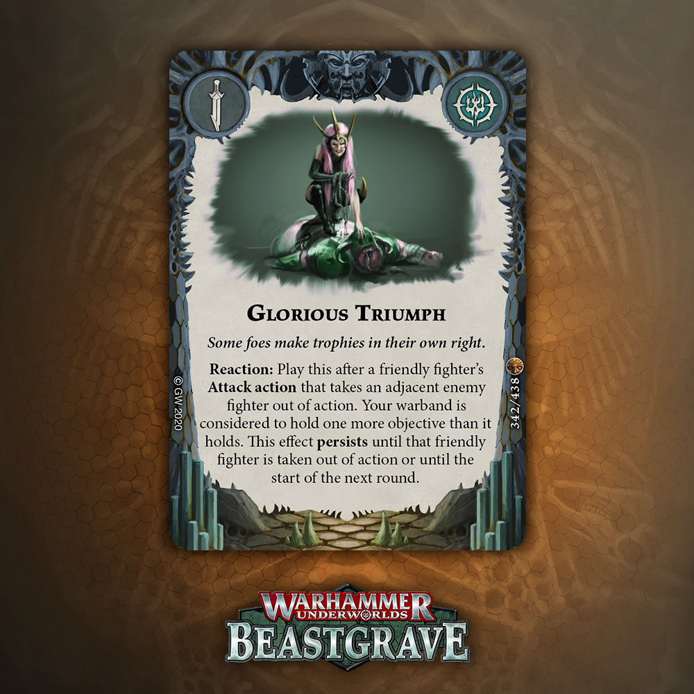 Temporary Victory was strong enough to get Restricted. This is Temporary Victory in miniature, so while it’s only a single Glory, it’s basically a free Glory for Warbands that are holding Objectives anyway. Heck, any Warband can usually manage to hold 2 Objectives at some point.