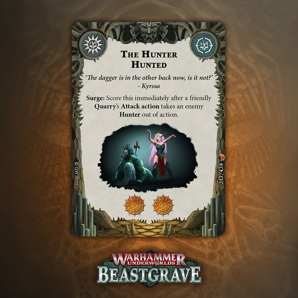 Surge for 2 Glory after a Kill is really good, but not only do you have your own Quarry restriction, you need the opponent to be a Hunter, which really depends on them either playing a Hunter Warband or playing Hunter upgrades. If you know the meta is rife with Hunters, this is great, but it’s too risky for an event where you might play against zero Hunters.