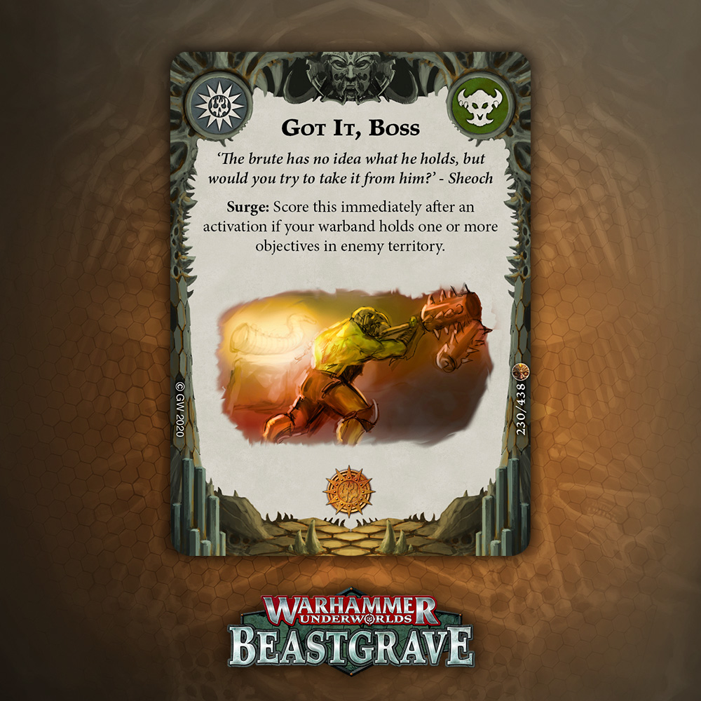 Surge for holding objectives is extremely good, but holding 2 with a three fighter warband is pretty difficult, and not what you want to be doing. Got It, Boss has the advantage of being a single action to score, and still scorable if you lose 2 fighters. This… isn’t as good.