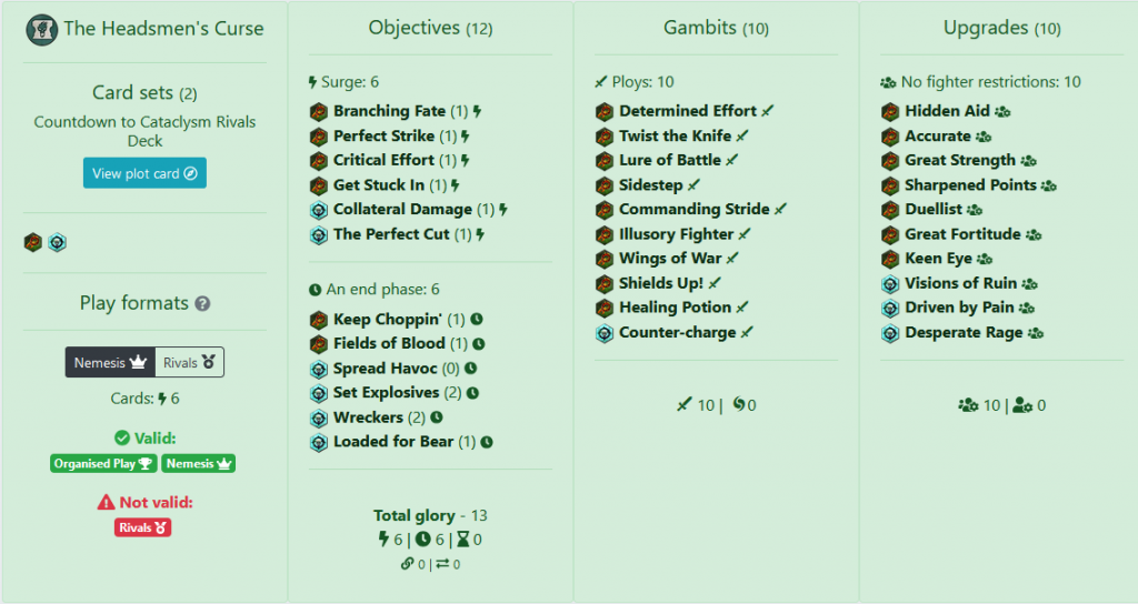 The final deck list, ready to take into the wild and test it a few times. Maybe it'll even be good! Credit: underworldsdb.comIf it still feels a little overwhelming and you'd like to take a look at decks others folks have made, the Battle Mallet team not only have a podcast and event organizer resources, but they also maintain a Nemesis Deck Library that features decks from the community as well as decks taken from tournaments. This edition is still fairly new, but they've done a good job of populating it and keeping it up to date as each new event wraps up. Another blog focused on newer players, Spent Glory, has a whole slew of articles on building a deck (they're from the previous edition of the game, but still hold golden nuggets that can carry over to this edition).