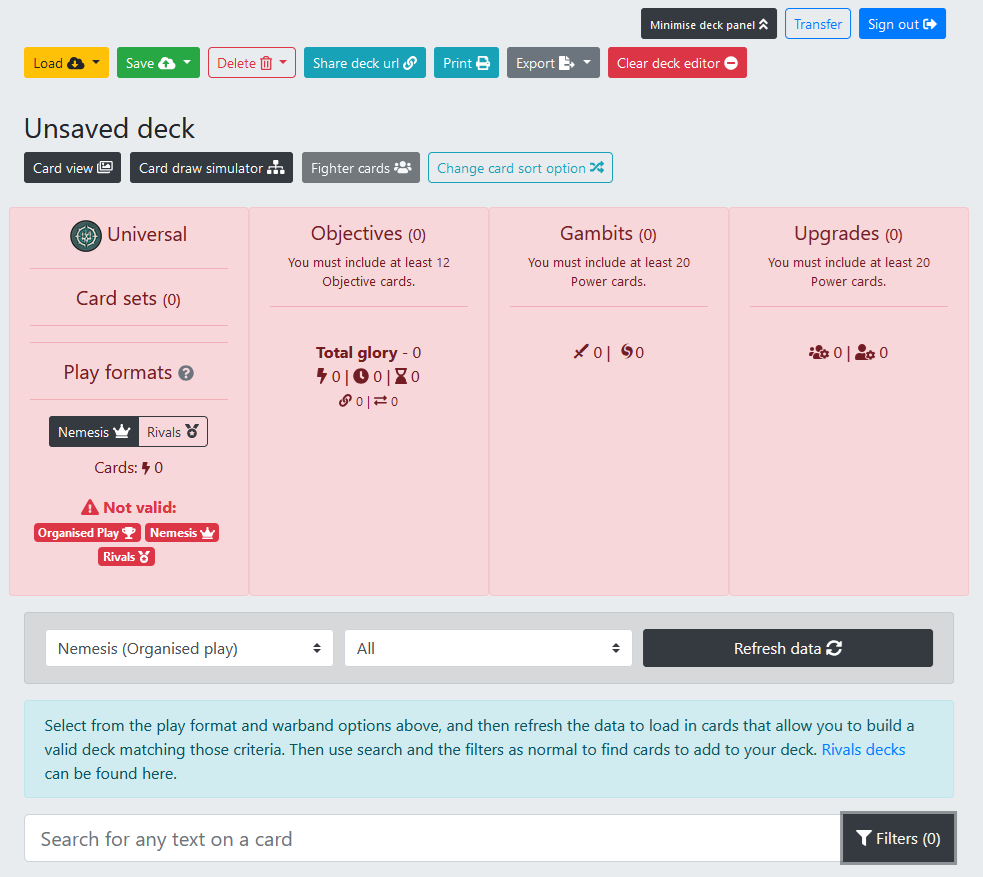 A clean slate for building your deck over at Underworlds DB. Yours will show "Sign in" in the top right until/unless you sign in with a Google account. Credit: underworldsdb.comThe first thing to do here is to go down to the drop down menus below the big pink box. Make sure Nemesis (Organized Play) is selected, then pick your warband of choice from the second menu. Once you've done so, click Refresh data to load up the warband and all the potential cards. I'm going to pick The Headsmen's Curse for this demo because I have been wanting to build a deck with them and also because my wife has expressed interest in trying them out. I can't wait to be the second best Underworlds player in my household.
