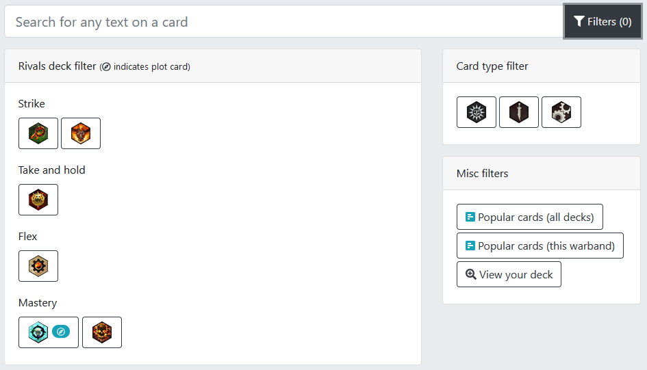 This is where the filtering magic happens. Credit: underworldsdb.comThe left side lists all the current Rivals decks split up by their archetypes as given by GW. It also includes a little icon to denote if any of them have plot cards, which is helpful because you are only allowed a single deck with a plot card in Nemesis. If you don't know the deck icons by heart, you can mouse over them to get a tool tip including the deck name.