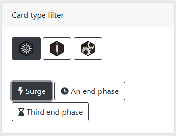 After picking those two decks, you'll see the filter is applied automatically and now your card pool is a much more reasonable 64 entries (filtered from 188 total entries**). But we can narrow this down even further by using the Card type filter on the right side of the filter panel. My deck building process tends to start with the surge objectives, then end phase objectives, then either the ploys or upgrades – I do it this way because games are won or lost based on who can score their objectives, so I want to make sure the rest of my deck is centered around supporting them.