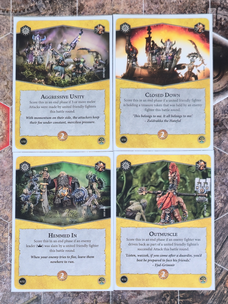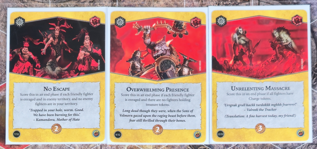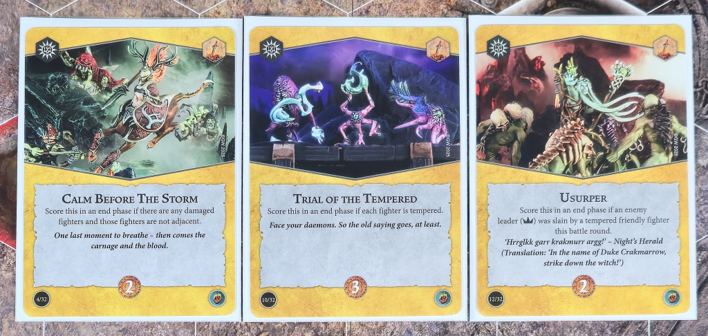 Trial of the Tempered is the three glory bomb that the deck has and requires every fighter, friendly and enemy, to be tempered in an end phase. Conveniently, healing your own damaged fighters can pull them out of tempered status which helps block both this objective and the previous. You can also make a point of not damaging or slaying the fighters your opponent brings who don't start tempered – this is risky, because those are typically their leaders for the small horde warbands who have very important abilities and the deck also has two ways to temper their own fighters regardless of health or damage.