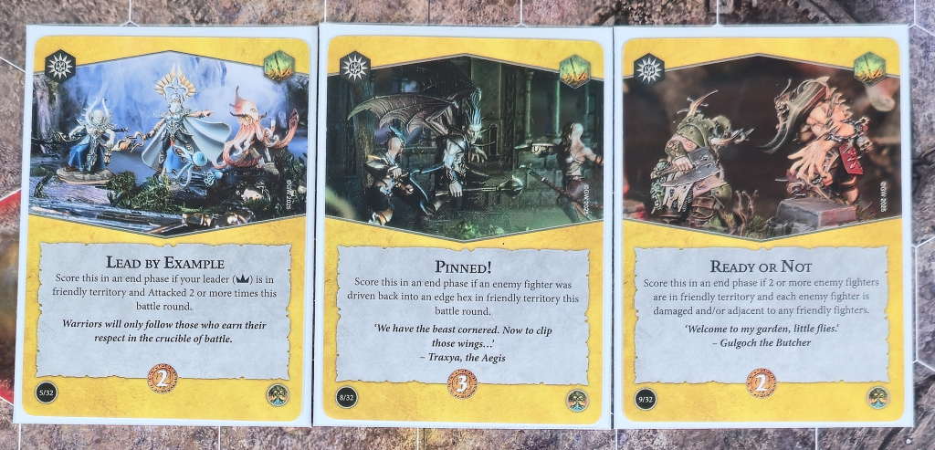 Lead by Example can show up, particularly if their leader has a ranged attack. It doesn't ask too much of the player for a nice two glory payoff, but there are a few places you can interact with it. The most blunt method is to kill their leader before they can score it. Then it's a completely dead card, whether it's in their hand now or they draw it later. Another option is to deny the leader from making attacks – this is harder or even impossible versus some warbands. Finally, you can draw their leader over into your territory and not let them back into theirs. This is also tricky to do and requires some niche effects like Growing Concerns from Countdown to Cataclysm, but it is technically possible.