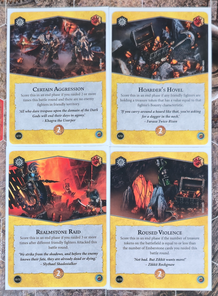Objectives in the Realmstone Raiders deck. Credit: Jake BenningtonAnother fairly niche deck, Realmstone Raiders will be picked when your opponent is focusing on making highly accurate melee attacks and they're likely to focus fire on your higher bounty fighters. You can throw a general wrench in their plan by preventing those from happening – stack the odds in your favor by making your fighters harder to hit with defensive buffs and sitting them in cover, prioritize taking out their accurate melee fighters first, and if you have a warband with very asymmetric bounties then keep your big bounty fighter from getting ganged up on and giving the opponent buckets of raiding opportunities. Realmstone Raiders is even less inclined to go after zero bounty fighters than normal, so leverage those fish, rats, lizards, and raised fighters.