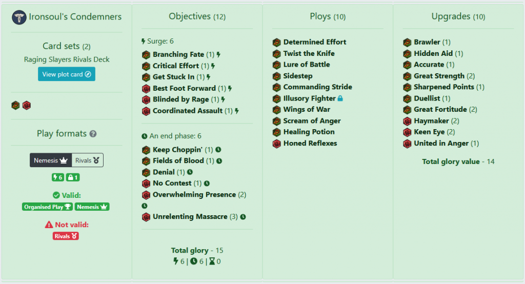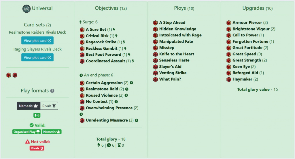 The issue with the previous design of this deck is that, as you can see, you needed a lot of rage tokens in order to score the majority of the objectives but those tokens were also a currency that you were required to spend in order to take advantage of many of the power cards. This created an unpleasant feeling where you could either score objectives or use your ploys and that frankly isn't a fun sensation to run into, especially when the other decks out there don't have these kind of internal anti-synergies.Now that rage tokens are more plentiful, players are going to be able to (usually) have plenty on hand in order to power their ploys and still enable scoring if you include the Raging Slayers objectives.