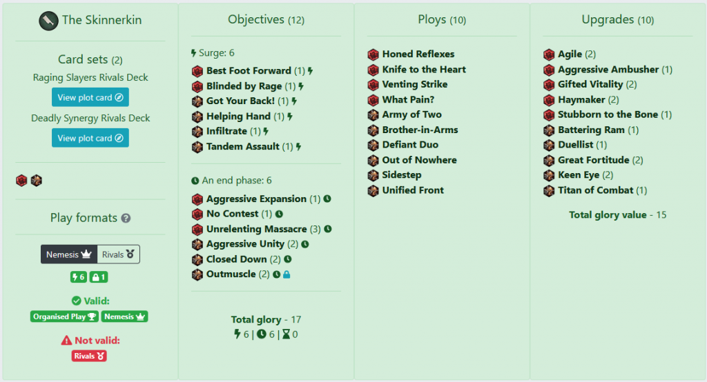 Jesse's Raging Slayers and Deadly Synergy decklist for Skinnerkin. Credit: UnderworldsDB.comFirst up is Skinnerkin with a Raging Slayers/Deadly Synergy deck combo that was piloted by Jesse, a local and Worlds top 16 finisher. This was the first time either of us had experimented with Skinnerkin and we were both impressed by how well the auto-crit mechanic from Raging Slayers fed into the warband's haunch generation. I was playing something with Pillage & Plunder as part of my makeup, and I was not prepared for how much Raging Slayers can enable Overruns off of attacks. It meant holding feature tokens was extra difficult. The reliable critical result isn't as handy once the whole warband is inspired, but getting them to that point seems to be their main hurdle.