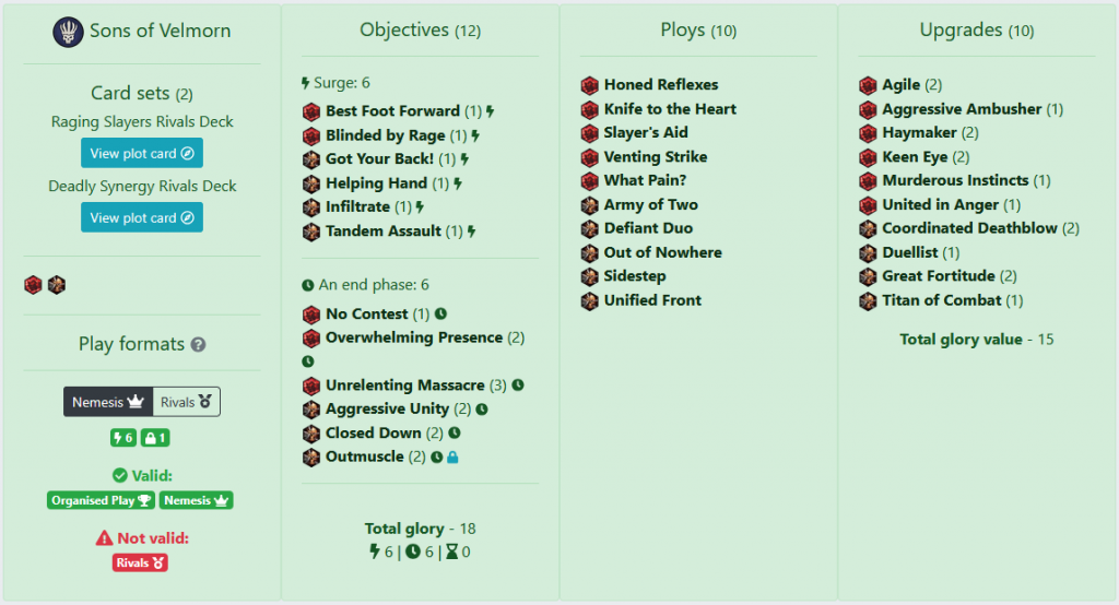 Spinnerite's Raging Slayers and Deadly Synergy decklist for Sons of Velmorn. Credit: UnderworldsDB.comNext is Spinnerite's Velmorn list that's also Raging Slayers/Deadly Synergy. Spinnerite is the author of whudice.com, the Underworlds dice probability calculator. Check it out if you haven't. There's a lot of overlap here with the previous deck which probably isn't surprising, but in this case it's being used to really amp up the damage output of this warband. By ensuring all the successful attacks will trigger critical grievous, it means the Sons of Velmorn are starting out with two fighters on three damage and three fighters at two damage; this flips after Faulk manages to inspire and the warband has a whopping three fighters hitting for three damage. Combined with their solid defense and recently revamped warscroll, this is a warband that can leverage the new deck quite well.