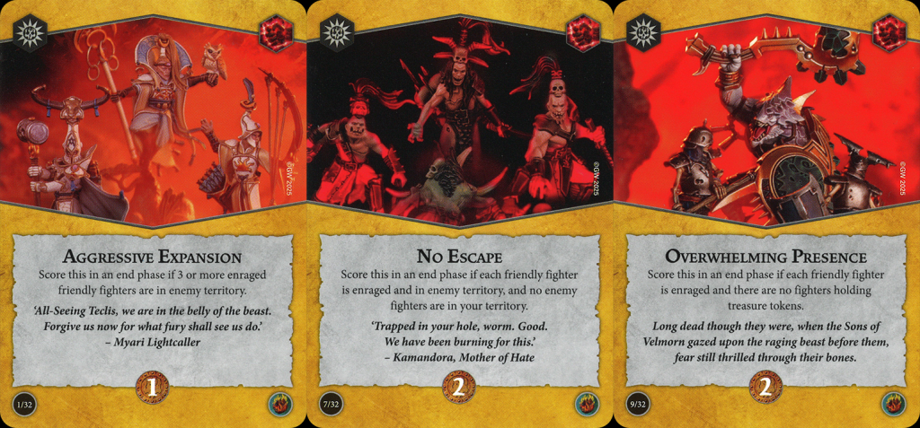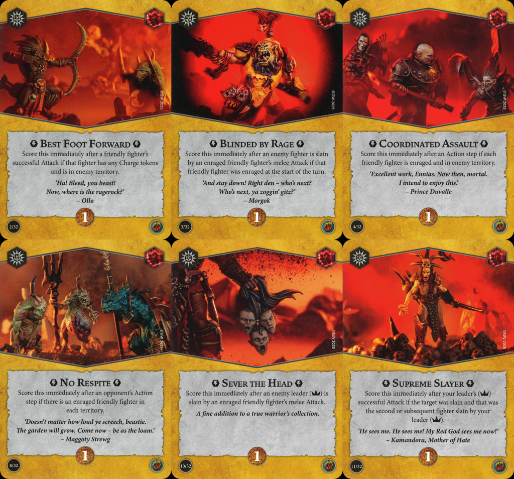 Coordinated Assault and No Respite are also both going to be much easier to score when you're able to rain rage tokens down upon your warband. They're still working at odds with each other, which is obnoxious, but you can select the one that's going to be the most reliably scored by your particular warband and include it for a reasonably easy surge if you're planning to do a lot of charging – and that's what this deck is all about, after all.