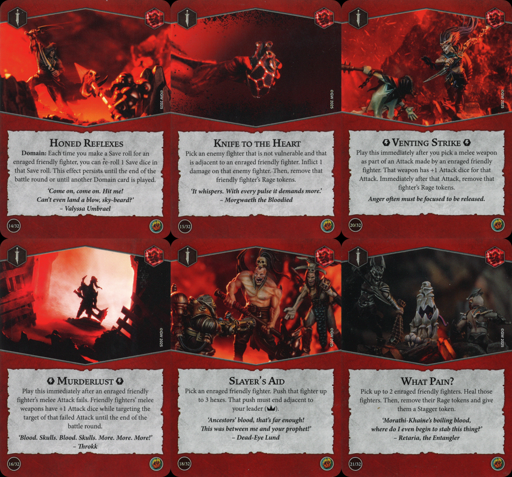 Sever the Head and Supreme Slayer don't change at all with the update. The former is still annoying because it restrains your choices during a game. What if you have a shot at taking out an enemy leader but don't have this card in your hand yet? Or if you draw the card but it's just not the right time to go for the leader? Supreme Slayer still has too many restrictions tacked onto it for me to want to include it. It's at least easier to get rage tokens out, so maybe a warband like Mollog's Mob could find a way to use it…