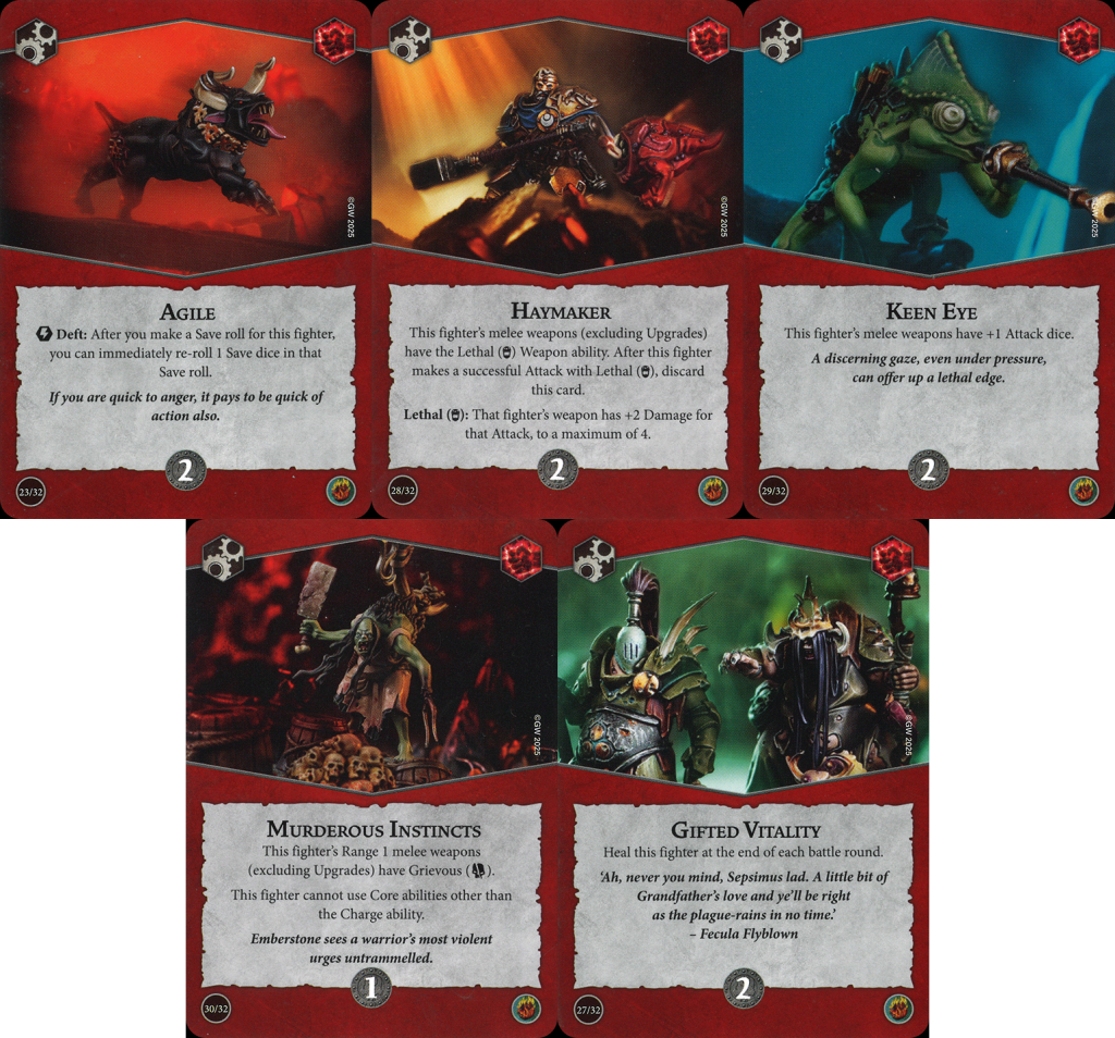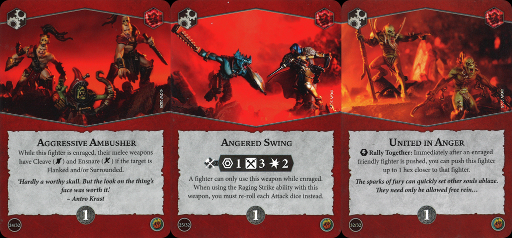 Raging Slayers cards. Credit: UnderworldsDB.comThere are some generically useful upgrades that didn't care about rage tokens and (surprise) they're still generically useful. Agile, Haymaker, and Keen Eye haven't changed and will still be taken in many cases. Murderous Instincts and Gifted Vitality also don't care about the change, but are a little more niche in their applications. Take them if they work for your warband, skip them if they don't.