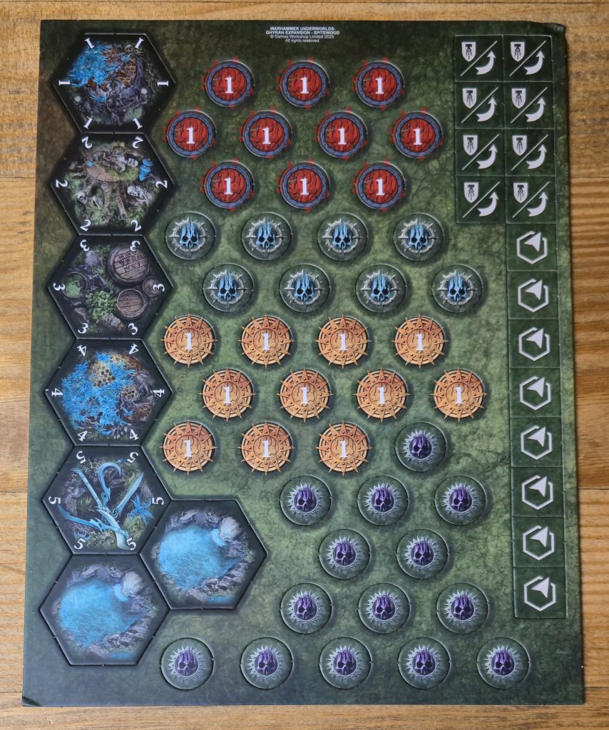 The tokens of Warhammer Underworlds: Spitewood. Credit: JakeMy copy of the punch out token sheet was a little banged up in one corner, so one of the double sided guard/stagger tokens has a curled edge. Chances are slim that I'll ever need all 8 copies of those tokens in a game (and I can almost do a Scrooge McDuck dive into my existing pile of tokens) but it would be unfortunate if the other corner of the board had gotten dinged up because that's where the treasure tokens are. The treasure tokens themselves are a nice visual departure from Embergard's. We're trading out the very definite underground mining motif in Aqshy for some green and blue weird Ghyran stuff – plenty of plants, glowing bugs, and what I can only assume are barrels of Malört. There are also two additional hexes here that are the Aqua Ghyranis Feature Tokens which we'll talk about in more detail shortly. These are technically double sided in that they have different pictures on each side, but the Spitewood booklet points out they're functionally the same. The "limpid pool side" is used for the new Spitewood boards while the "lifewater vial side" more closely matches the aesthetics of the Embergard board, complete with chunks of orange emberstone.