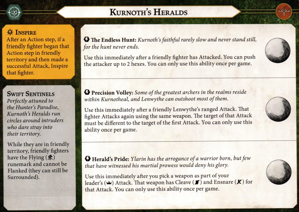 The Endless Hunt is the only one-shot warscroll ability that can be used by any of your fighters, but it's a solid one. Any accesses to pushes often wind up being some of the most impactful abilities on any warband's warscroll, and getting to push 2 hexes is a sizeable amount of the board. It can be used as a pseudo-overrun to claim hexes your opponent was standing on after driving them back, even from 2 hexes away if attacking with Lenwythe or Ylarin. Since it doesn't require a successful attack, if your cheeky turn 1 charge into enemy territory to try and inspire a fighter fails due to missing the attack, you can also use it to scoot back into friendly territory for another try.