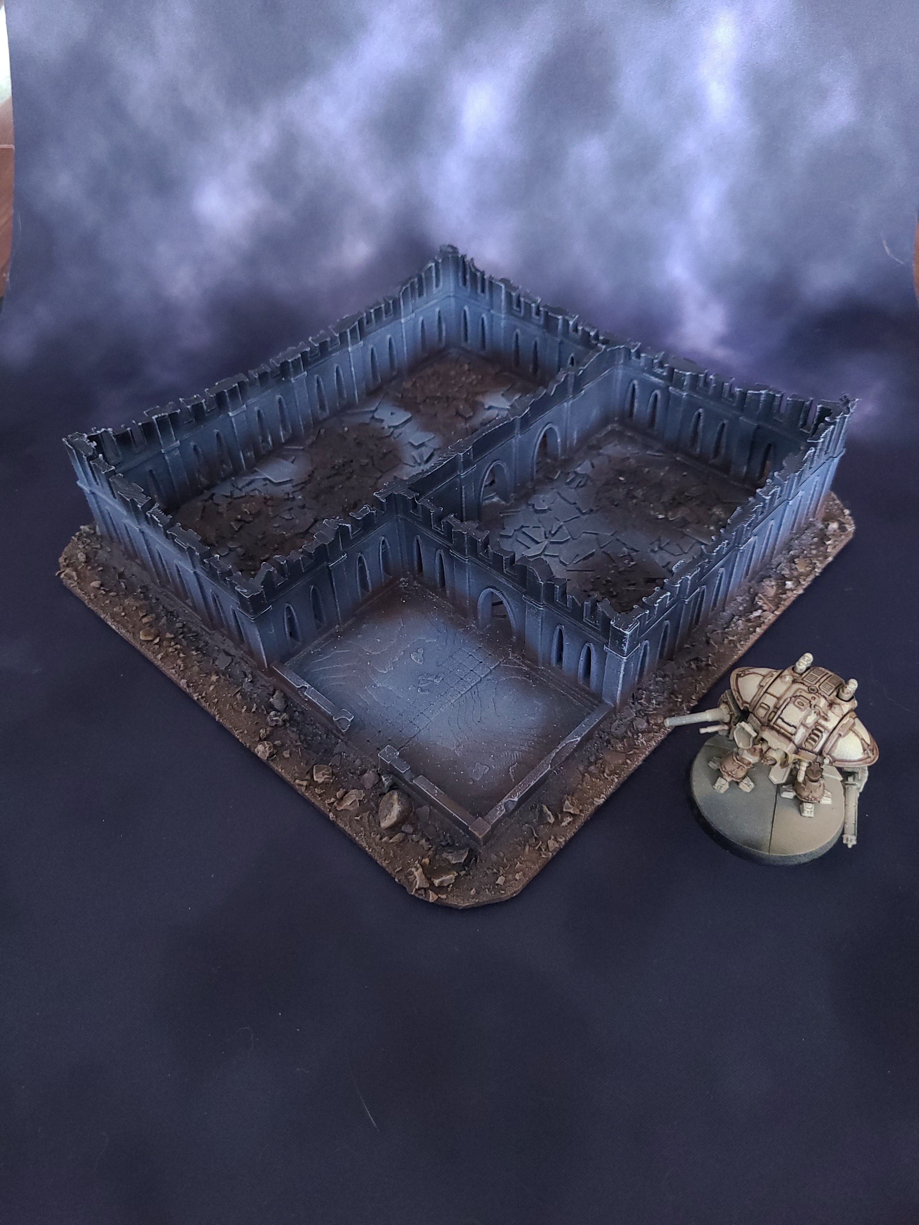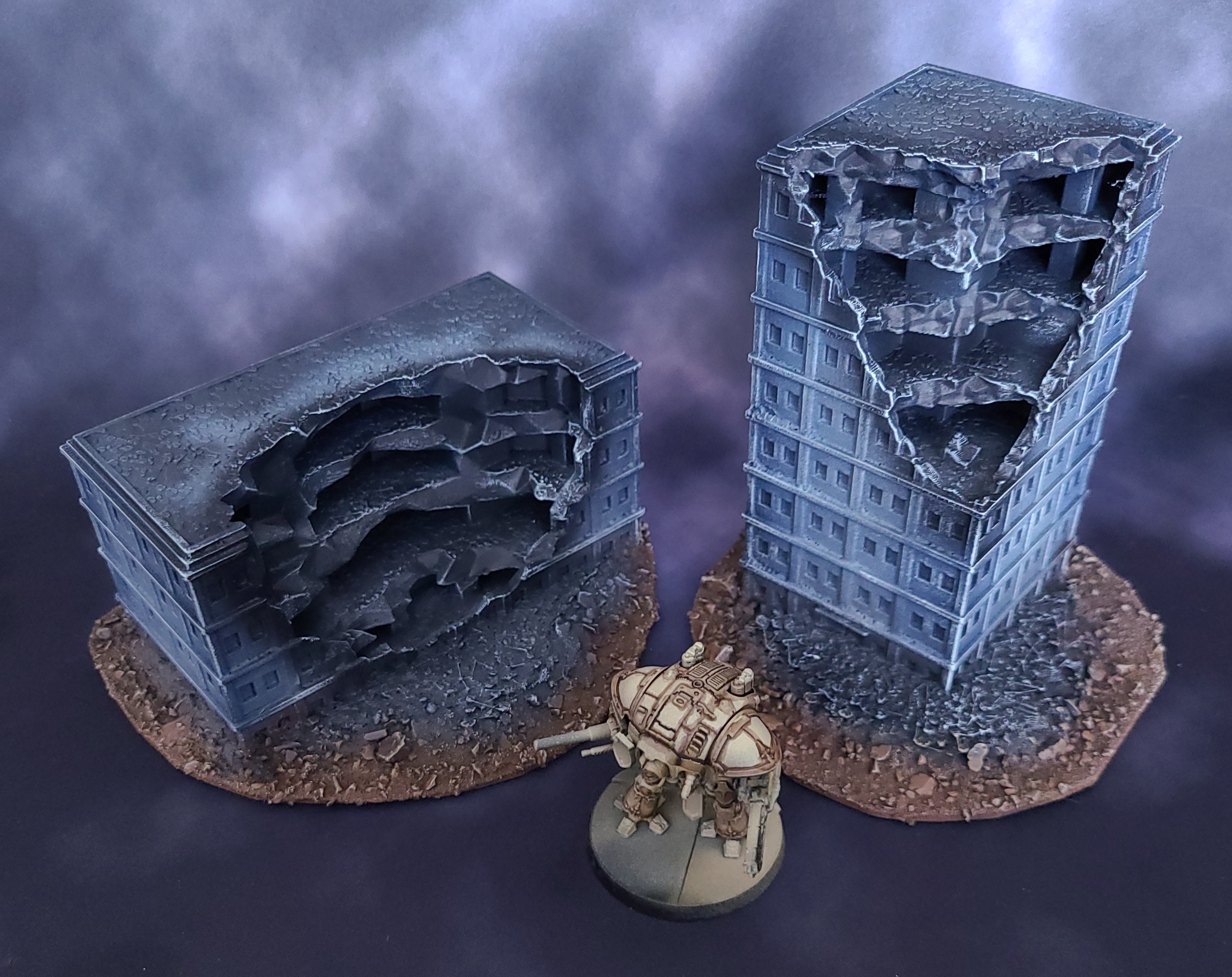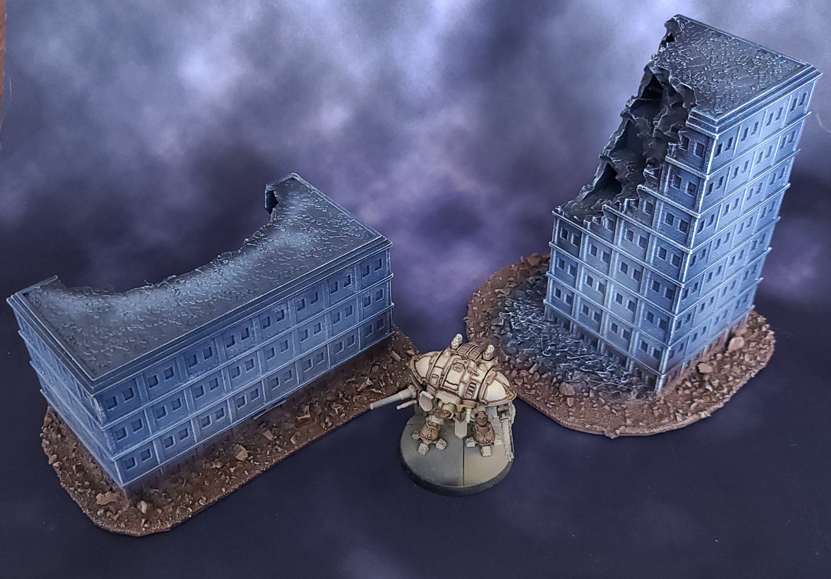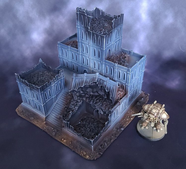 I've been wanting to play for years and the latest release finally got me. To help garner local interest, I've started on the terrain first. Goonhammer has an excellent guide on Titanicus Terrain, and it inspired me to paint my own. I didn't want my buildings to be intact, so I found some ruined equivalents instead. If you have access to a 3D printer, you can purchase these files and print them yourself or buy them printed from someone else (the designer sells printed versions off eBay).