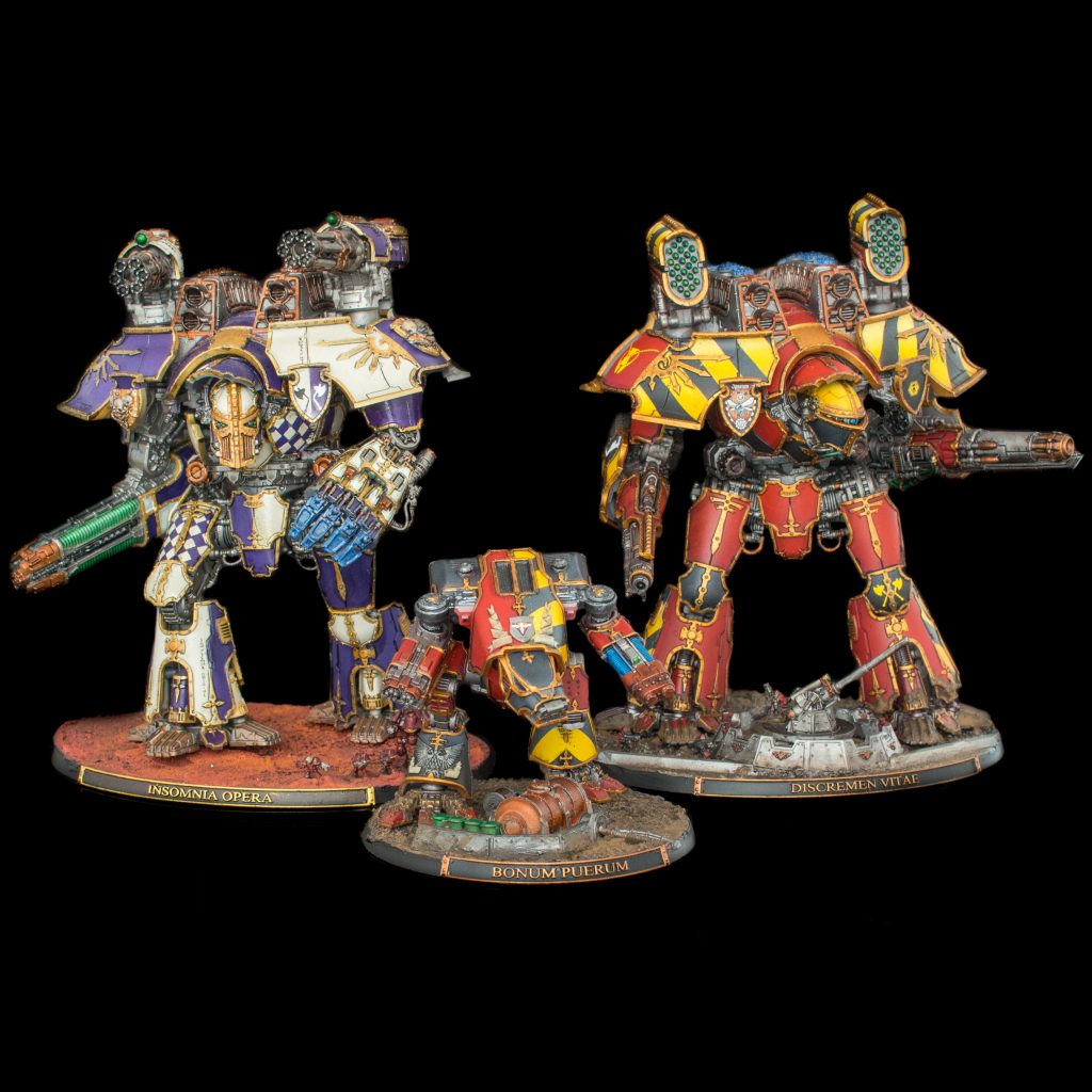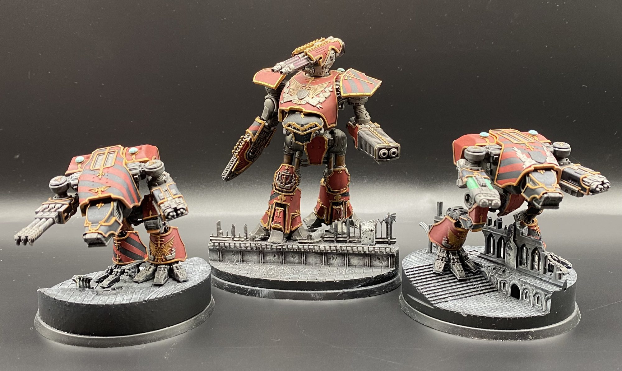 My only real issue with these is the design itself. Also, a very common issue with Titan basing in general, is that the sheer weight of these god-engines would surely destroy more of the stone work, but they do look cool!