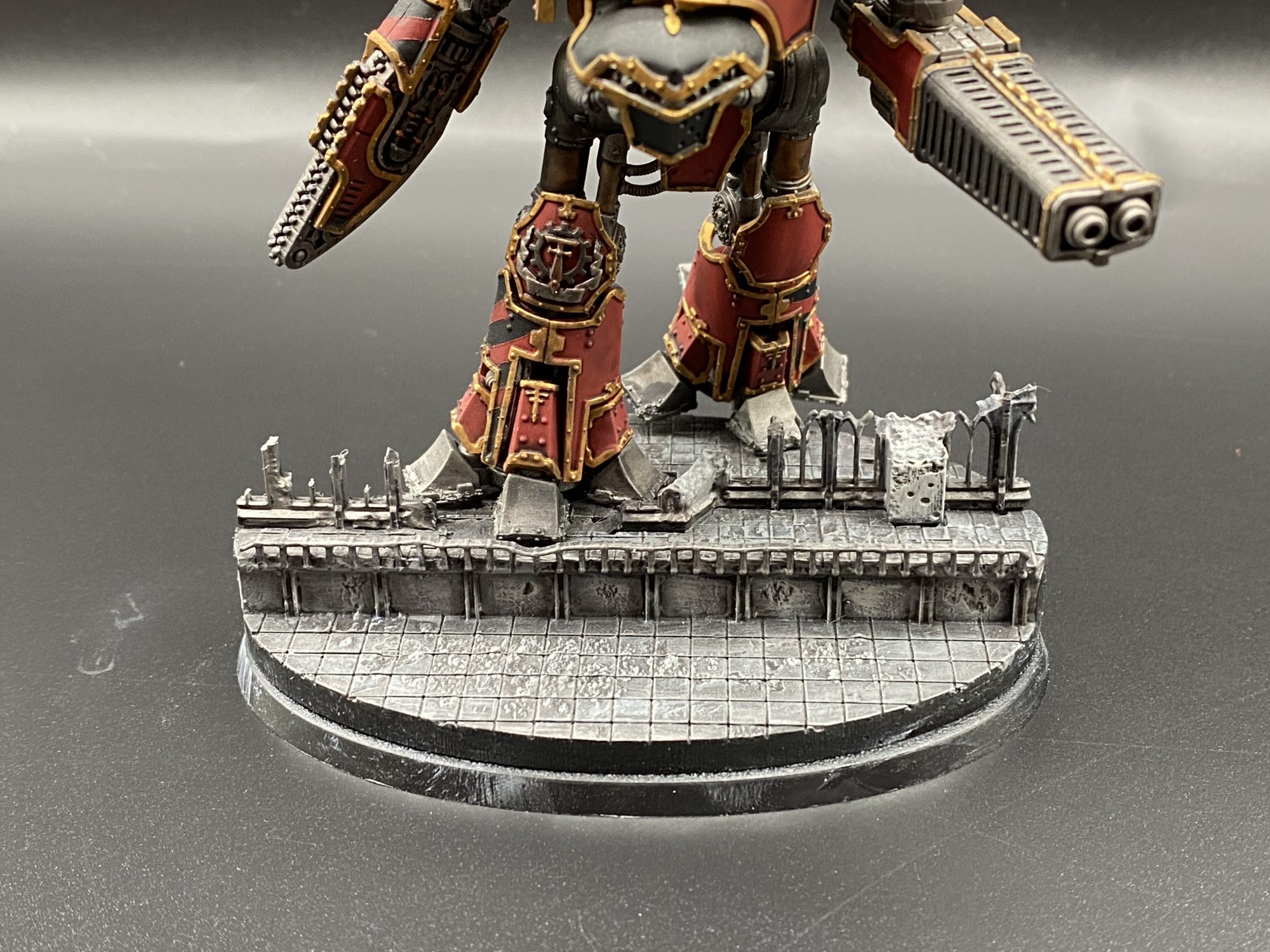 They seem to be designed for aesthetic first and foremost, not taking into account the models that you’re mounting on them. One of the Warhound bases (armed with an inferno gun in the pictures) I had to cut quite a lot around the knees to make it fit onto the base at all. While I do really like the pose that I was able to get from it, despite it not setting entirely right in the hip (my own fault since I hadn’t noticed while it set) this base in particular is not for a newer modeller or someone that doesn’t want to mess with cutting up frankly expensive pieces of plastic that might not come out great.