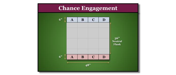 Chance Engagement is similar to Lines of Battle, but with a twist: before starting deployment, you allocate each of your units to a sector. This deployment map requires a good deal of Line-of-Sight blocking terrain for the allocations to be significant and differ from Line of Battle.
