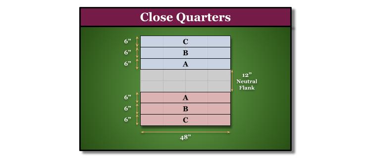 The spiciest of deployment maps, Close Quarters is a gift or a curse depending on your perspective. After deciding on table edges, each side is divided into three sectors. Each player then alternates placing their unit with the smallest scale in Sector A, followed by the next smallest in B, followed by the remaining units being deployed in the back field. Dice advantage for the first turn is given to the player with the smaller scale unit in Sector A.