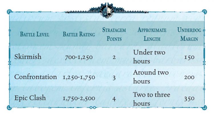 Before you assemble your battlegroup, you’ll need to agree on what scale of game you want to have with your opponent. There are three different battle levels you can choose from which will decide how many engines and tricks you’ll have at your disposal. Unlike other systems, where you try to squeeze every last point out of the upper limit as possible, you can instead choose to purposefully take a smaller force to gain some benefits. If your battlegroup is smaller than your opponent’s by at least the Underdog Margin, you get two benefits. First, you get an additional two stratagem points. The second benefit is that you get to choose your objectives after your opponent reveals theirs, which allows you to respond in kind and pick an objective that will complement yours - not to mention potentially hampering theirs.