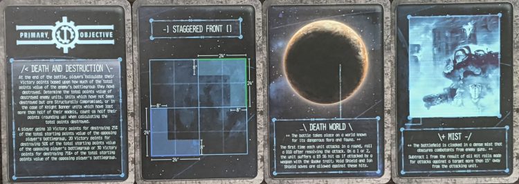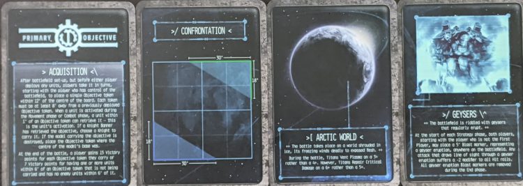 So now that we know what’s in the box, how exactly are these cards used to create a game? Well, there’s a reference card included in the box that will tell you how to use them. First, divide them into separate decks, separating by their type (Deployment, Planetary Effects, etc) and then draw a Deployment Zone, a Primary Objective, a Planetary Effect, and a Battlefield Effect. Then each player draws two Secondary Objectives each and secretly chooses one, revealing at the same time before deployment.