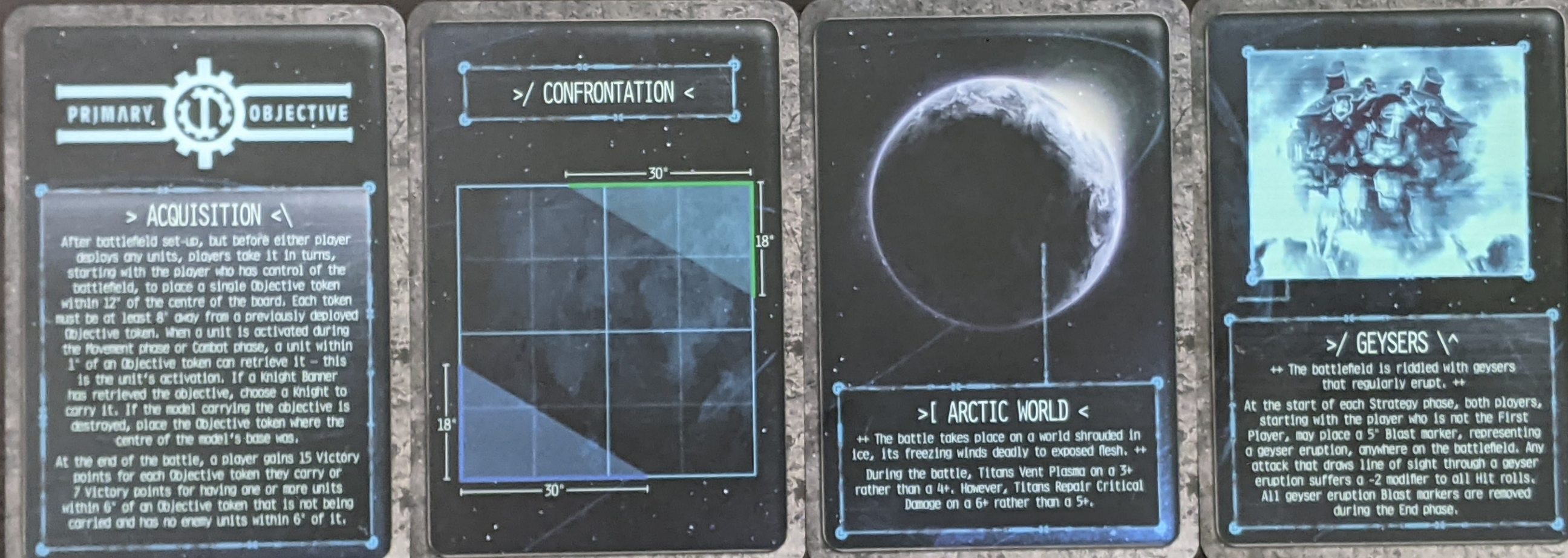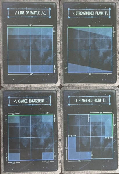 Despite how much we love these cards, it's important to recognize that they're not perfect. First, it's not clear how deployment works with them - while the maps for the deployment zones are great, the Core Rules don't have a "default" deployment method, so it's not clear whether you should deploy alternating units or do the "half and half" deployment from Stand-off in the Core Rules. However, since more missions (including the "training mode" Titanic Clash) mission use fully alternating deployment, that's what we did.