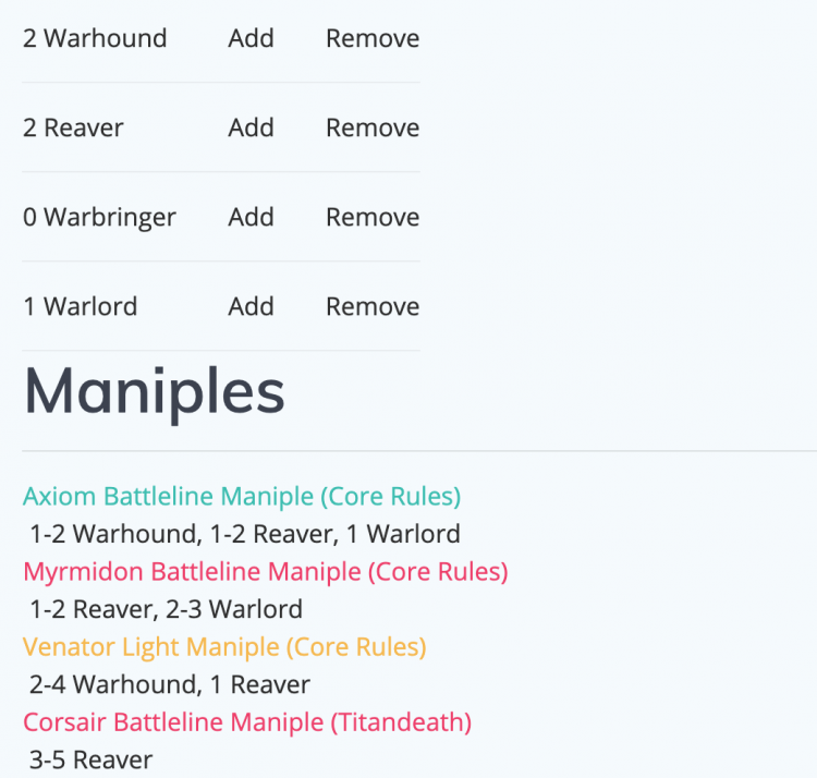 The AT Maniple-ator in action.It works like this: add and remove Titans at the top to match either your collection or your planned shopping binge, and the Maniples below will color-code based on what your options are for open-palm slamming those bad boys into a list. Green and Yellow are the good colors, since those are either a perfect match or leave you with extra support Titans, and red means you somehow haven't bought enough models, you absolute degenerate. Note: I didn't include Knights because I hate them, and I didn't include the Legio-specific abilities to swap around Titan classes because it's too hard to code.